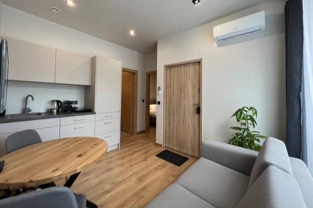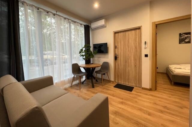 Our apartments have been designed with attention to detail, combining modern style with functionality to provide you with maximum comfort. Each apartment consists of a spacious living room with a kitchenette and a separate bathroom. The kitchens are fully equipped, allowing you to prepare your own meals. Free Wi-Fi is available throughout the hotel. In addition, there is a laundry room located in the building.