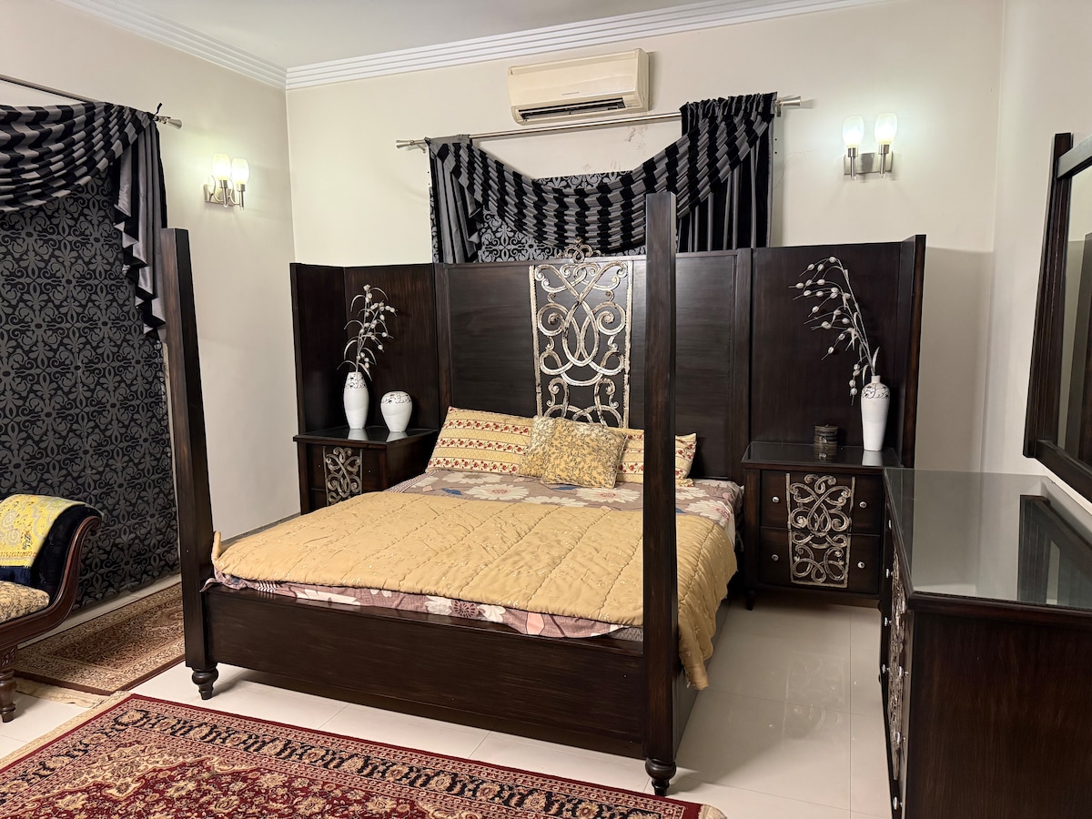 Welcome to our elegant and well-maintained banglow. This listing is for a private portion of the house, thoughtfully designed for family comfort. The portion is located on the First floor and offers three furnished bedrooms, each with an attached private washroom, along with a fully equipped kitchen and a comfortable lounge, dinning. The space is professionally cleaned and includes AC, TV, high-speed Wi-Fi, fresh linens, and essential amenities. Secure, peaceful, and exclusively for families.