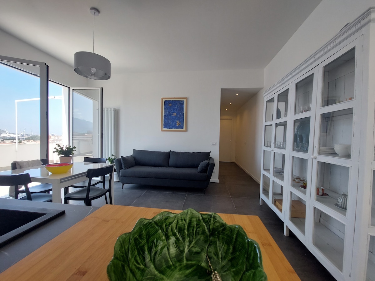 Enjoy a stylish holiday in this space located in the historic centre. The apartment enjoys a spectacular view over the rooftops, the mountains and the sea of Palermo, thanks to a large and very pleasant terrace. It is a brand new and well-renovated apartment close to the most interesting historical-artistic places in the city, which can be visited on foot, and well connected to any destination, thanks to the proximity of the central station and the main means of transport.