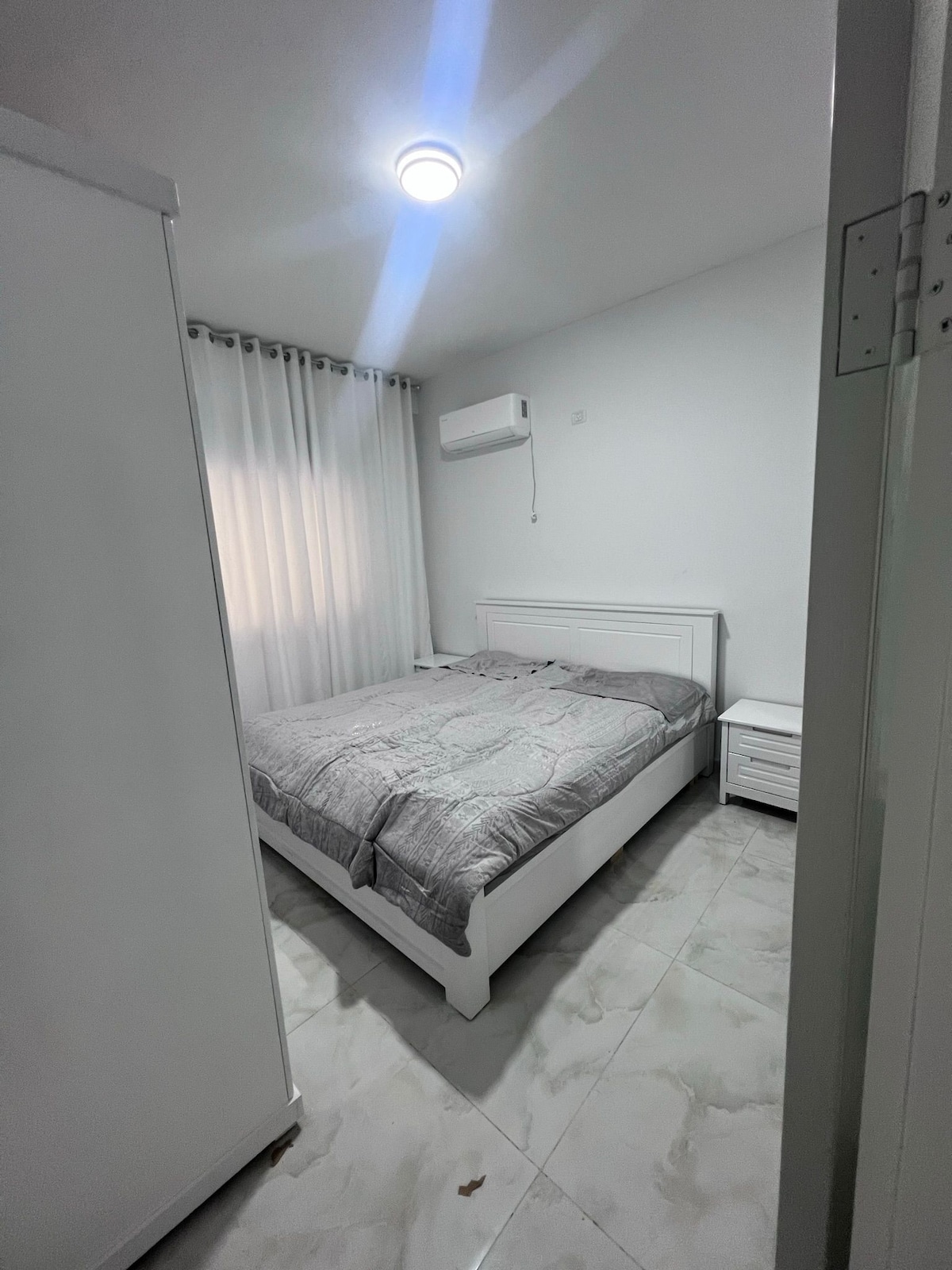 Stay calm and relax with your family at this quiet place. Clean, not yet inhabited, and located minutes from the town center on foot. The building is very modern. The apartment has all the comforts of air conditioning, heating, excellent furniture and integrated electrical appliances. One spacious bedroom with distinctive furniture and two bathrooms, one of which is a master bathroom. The bedroom is for two people, couples or others, or one person.