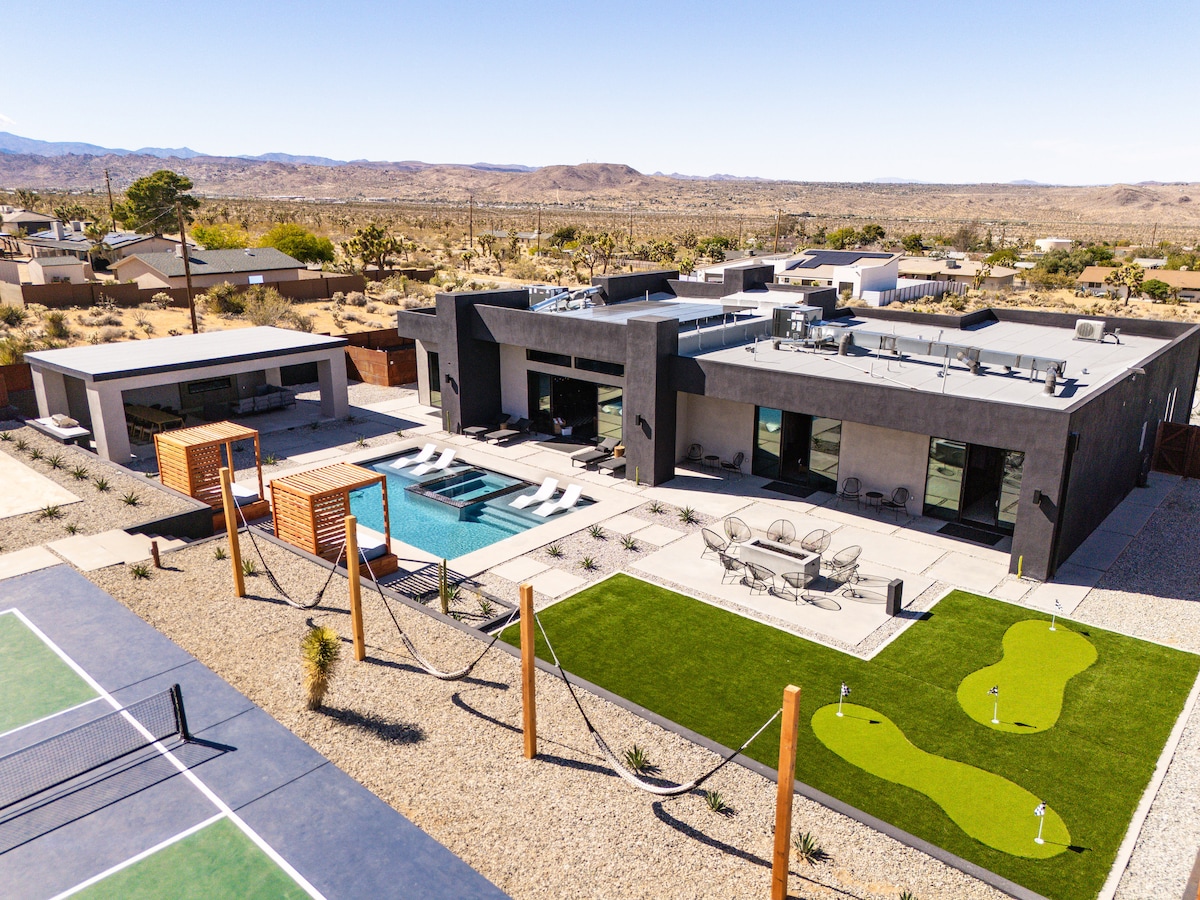 Spa themed custom estate on 30 Acres, only 4 miles to the center of Joshua Tree. Featured in Travel + Leisure, Domino, San Diego Mag and more. With no immediate neighbors, you can truly relax. Gaze out giant windows towards 100+ Joshua Trees & the national park. Amenities include a brand new pool & sun deck, oversized custom sauna, cold plunge, 8 person hot tub, separate yoga / group dining building, outdoor shower, chef's kitchen, EV charger, smokeless firepit and a private disc golf course.