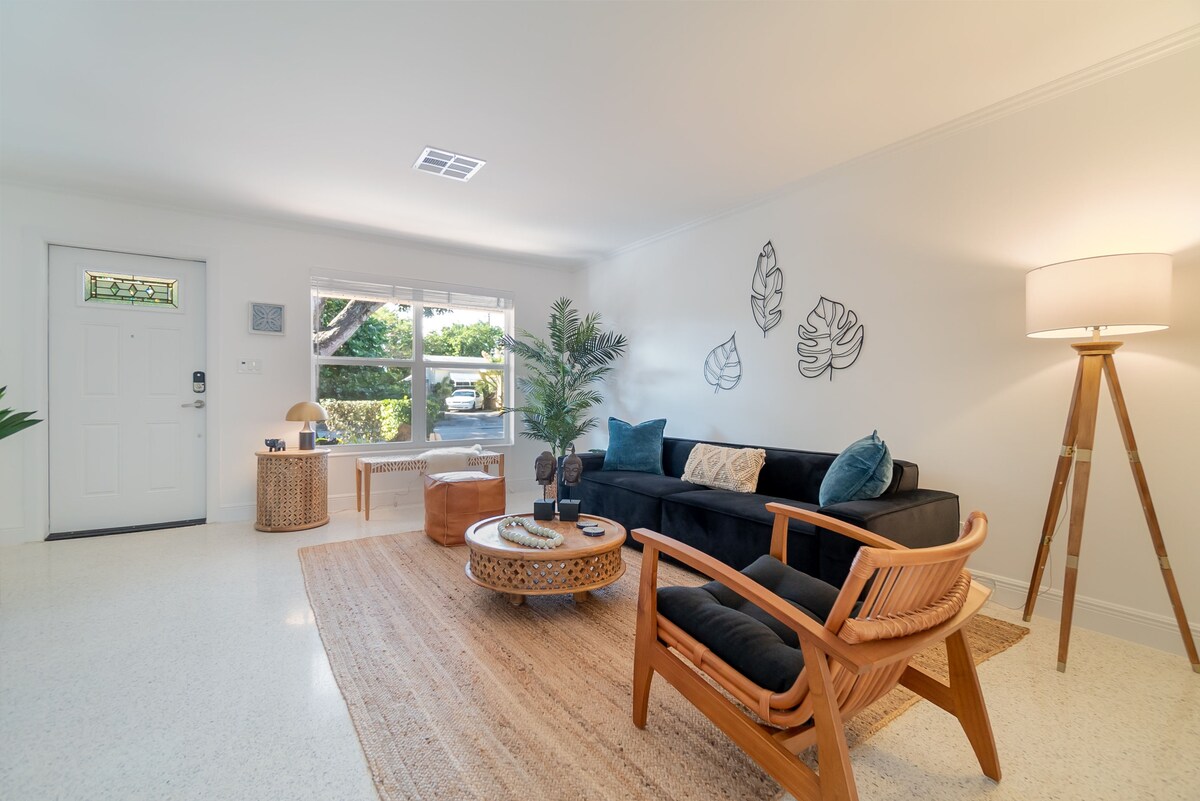 Mango Groves Beach Bungalow! Charming, tropical gem hidden in the middle of artsy Lake Worth Beach. Just updated, this immaculate 2 bed 1 bath is bright, spacious & super cozy with a beautiful large courtyard & private patio. 20 min walk or 10 min bike ride to the beach. Enjoy a plethora of amazing food and nightlife all just steps away. Free use of the grill, fire pit, beach cruisers, laundry, toys, beach gear, games and baby stuff! Providing you with a perfect 5 star experience is our mission!