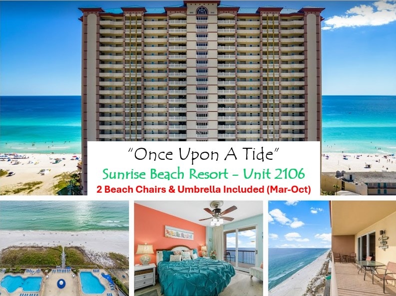 Relax on this units spacious balcony and watch the ocean waves crash underneath the sunset! The one bedroom unit offers a King bed in the bedroom, Twin bunk beds and Queen sleeper sofa. Full kitchen with essentials, full sized refrigerator and washer and dryer. Fully vacation ready! Located just steps to the World's Most Beautiful Beaches with a private beach access. You will also only be a 5 minute walk to the pier, restaurants, shopping and activities of Pier Park! Read More Here!