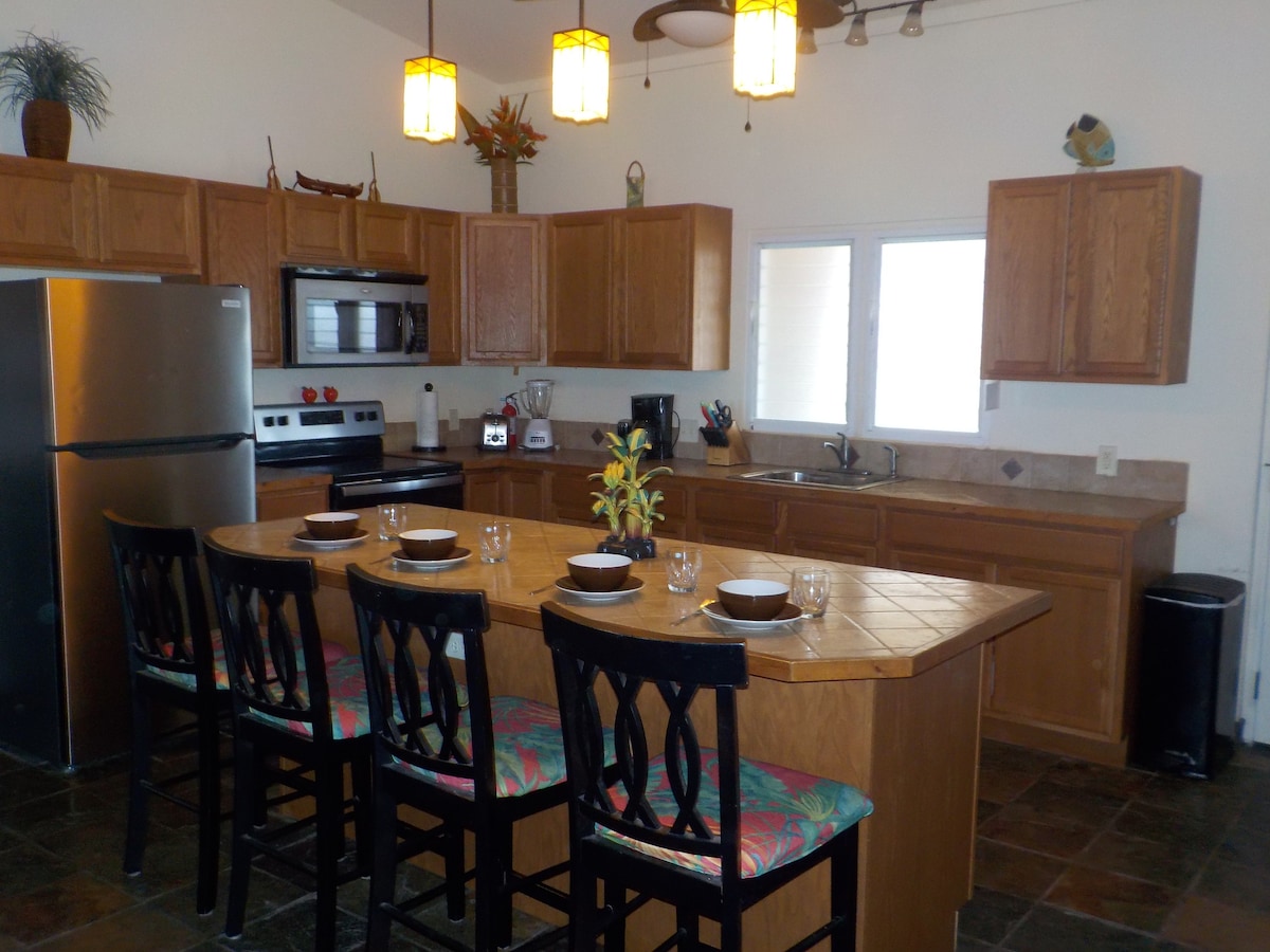 The Whale House is a great home to watch the whales migrate down the Kona Coast in season! The house has 3 private bedrooms and 2 1/2 baths on two levels. The upper (primary level) includes a full service kitchen, two master bedrooms and 1 & 1/2 bathrooms. The lower living area is separate from the main living space, is handicap accessible (See Accessibility Notes) and has a private master bedroom and master bath. The house is perfect for couples or families.