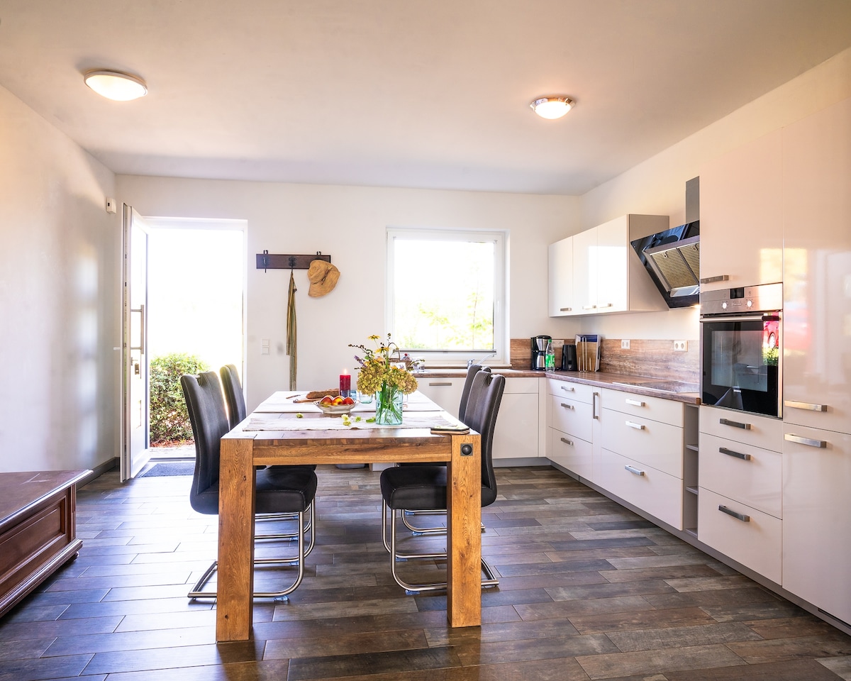... look out of your bed onto the water, enjoy the peace and quiet and listen to the rustle of the beech forest, experience bike tours directly on the water and enjoy nature. A beautiful, modern and rustic, low-energy half-timbered house with thatched roof, Moroccan tiles, oak floorboards and clay plaster walls awaits you. For activities there is a beautiful large garden with a forest swing, free steam sauna, outdoor shower and tub, a standup paddle, a paddle boat and 4 bicycles.