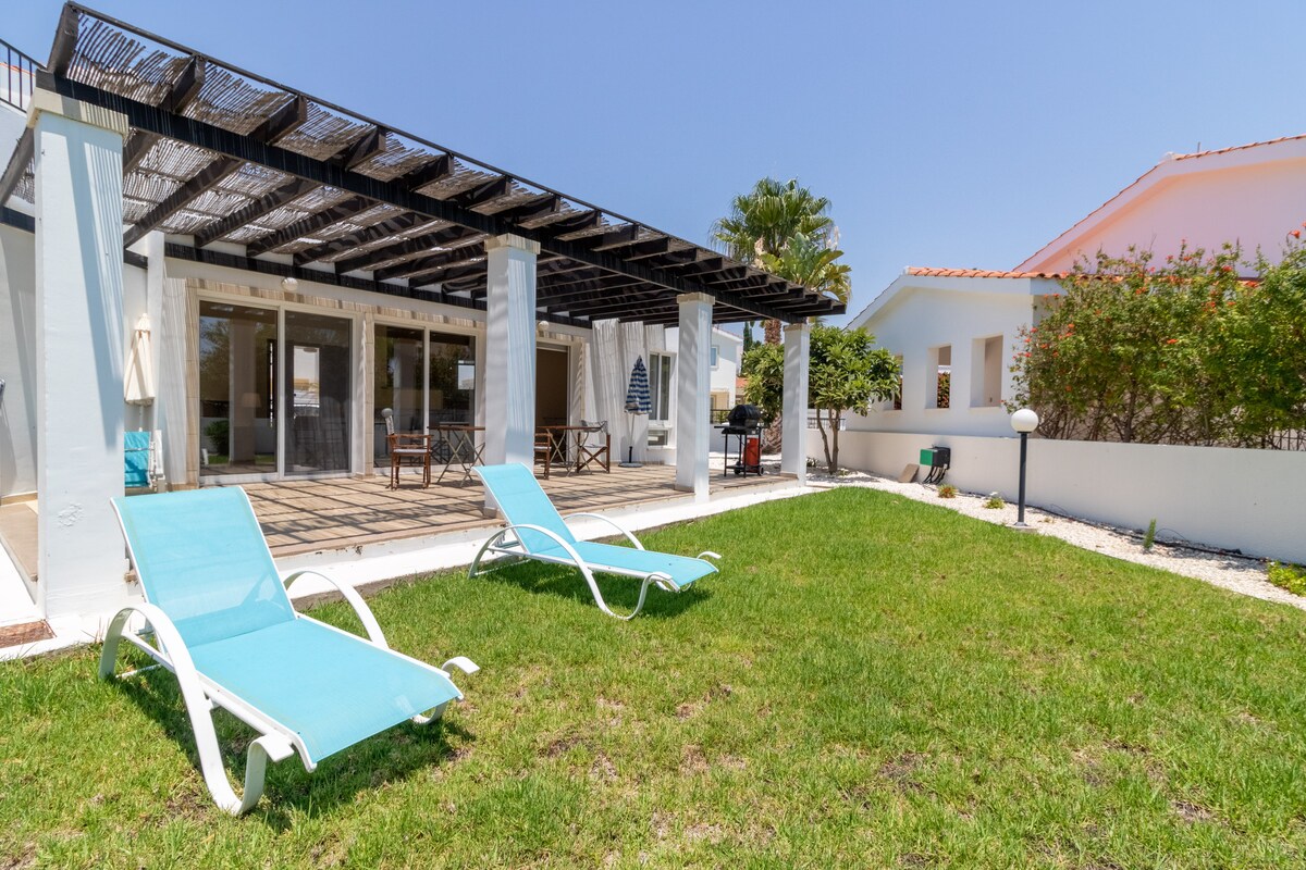 Ministry of tourism licence applied for. Premises ID979 318 7544 3 Convenient for families with small children and elderly parents 3 bedroom Villa Janna. Villa on one floor, three bedrooms, three bathrooms, a hall, a kitchen and a spacious patio turning into a recreation area with a green lawn. A 3-minute walk from the sea and one of the best beaches in Cyprus Coralia beach. The beach is equipped with sun loungers, umbrellas, showers.