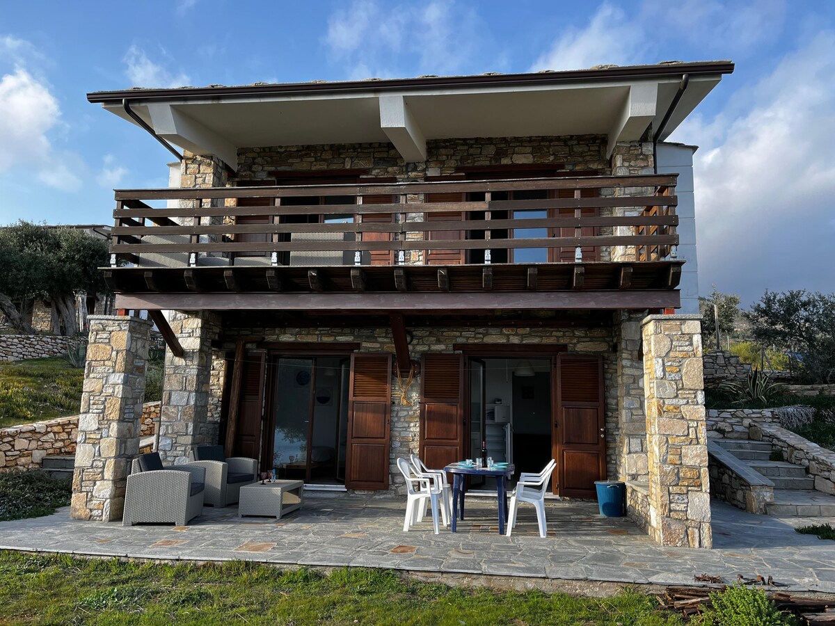 Apartment in a beautiful setting, surrounded by nature among olive trees. Newly built, on the first floor, with a panoramic terrace, it enjoys multiple comforts, inside a private residence of 4 units with a fenced garden of about 4000 square meters. The Euriale Residence can be reached by means of an unpaved road of about 1 km. The Residence has free private parking. You will enjoy a breathtaking view that sweeps over the fantastic Aegean Sea and Mount Athos.
