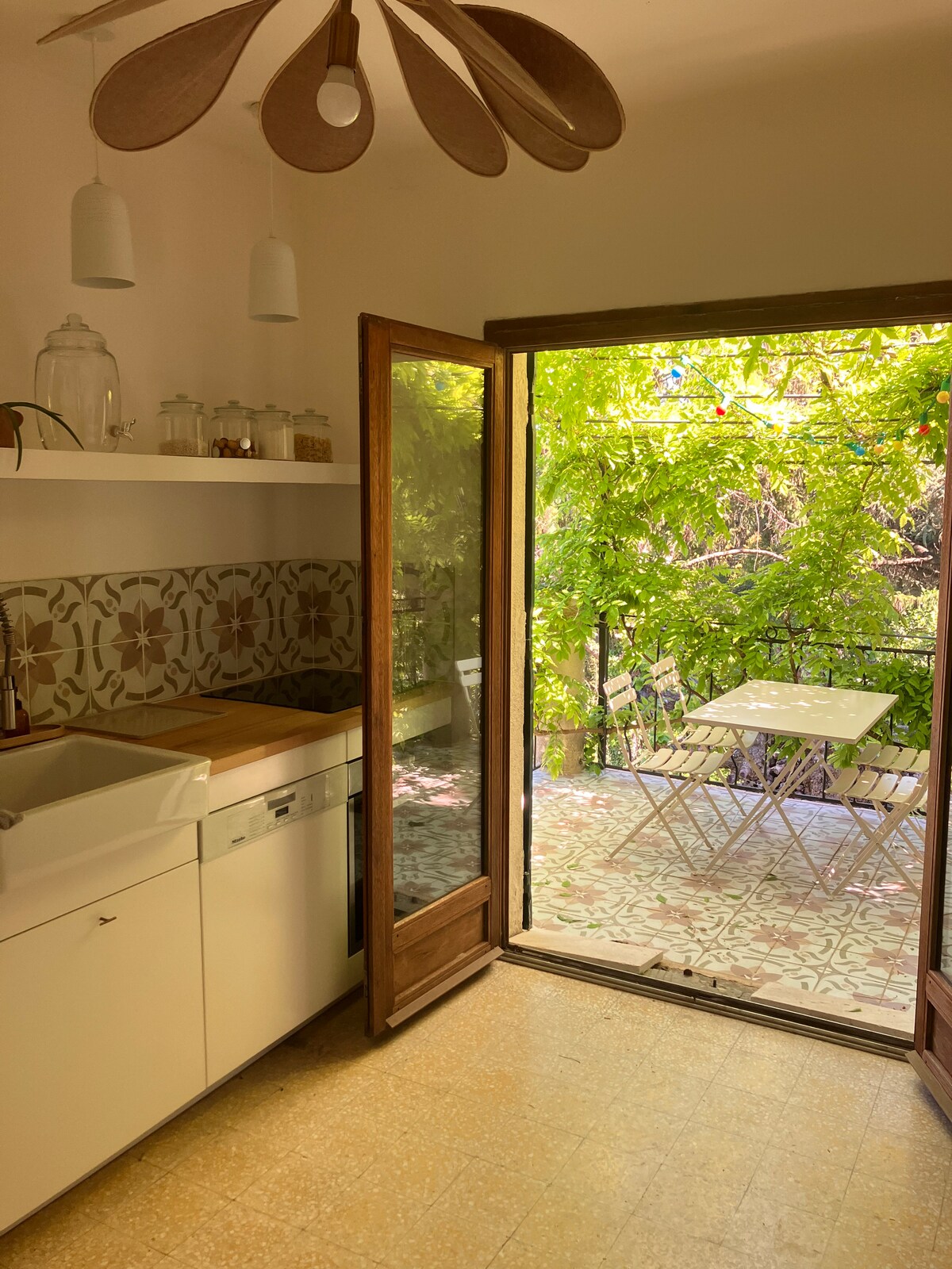 Large flat with lovely views of the Alpilles from the terrace, recently renovated. It comprises a large bedroom with a 160cm bed, a large bathroom with an Italian shower, a kitchen with a terrace shaded by its wisteria and a large living-dining room with a sofa bed. The bedroom has a pretty rattan cot and a high chair is available.