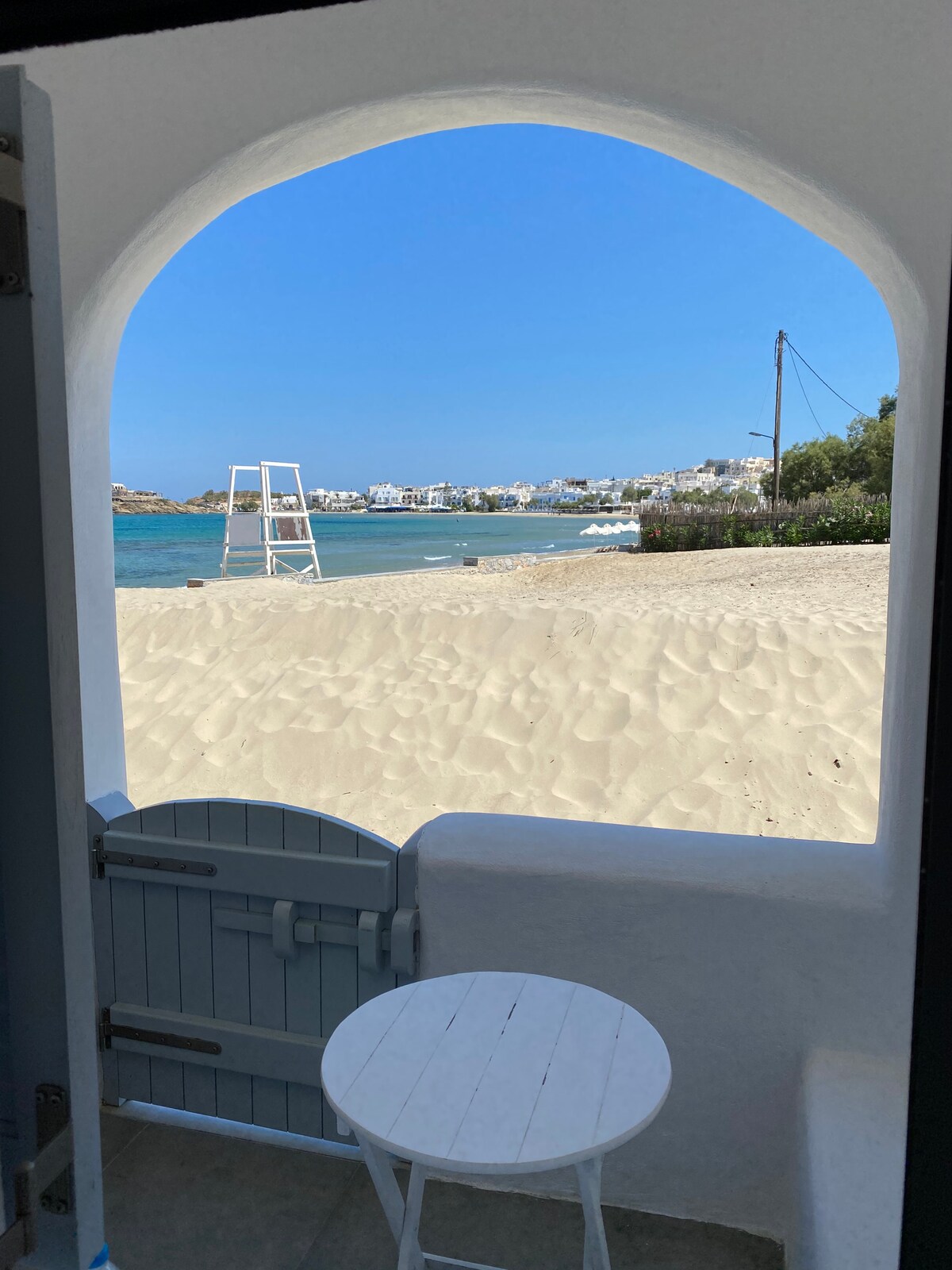 You can enjoy a side sea view and as you can see in the photos it is 15 steps from the sea. 10 meters away there is Sun Kyma café- bar-restaurant, where you can enjoy your meal you want during the day cocktails or breakfast . Next to the rooms you will find FLISVOS watersports club as well as a lovely sandy beach with sunbeds. You will find my place 10-15 minutes walking from the center of Naxos town (Chora) , 10 minutes by car from the port of Chora and 30-40 minutes walking with luggage.