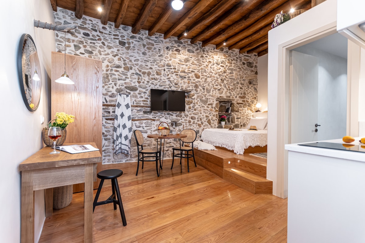 Our junior suite is close to Saint George beach (5min walking), Naxos' town centre, night life, public transport and facilities for all ages. It provides air-conditioning, fully equipped kitchenette, a smart TV, Netflix and wifi internet. The view of the terrace and the Cycladic design of the suite will make your stay unforgettable! The barbeque and the comfortable handmade mattress by Candia Strom will offer you relaxing moments in style.