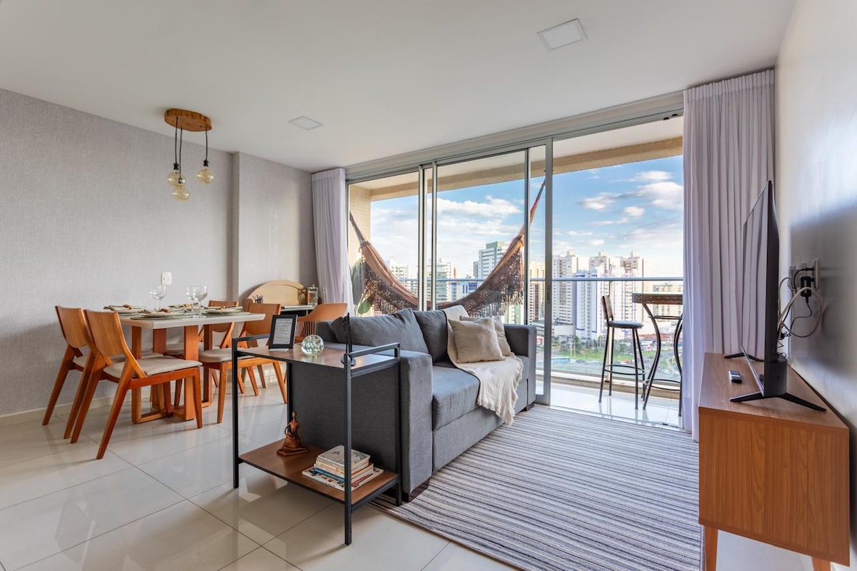 The apartment is ideal for couples, students, singles and any people who are looking for a lot of elegance and comfort combined with the practicality that the fine finishing furniture and the high quality utensils of the apartment provide. It stands out for its privileged location, with access to the Plaza Shopping DF and the supermarket Carrefour and Sam's Club within the complex that includes the condominium. That's right! Just go down to the Ground Floor, exit at the entrance and you will be inside Plaza Shopping. Inside is Carrefour and Sam's Club. - Netflix - Coffee maker - Laundry - Airfryer Equipped with four mouths induction stove, 360 liter duplex refrigerator, hood, table with two adjustable chairs, kitchen utensils - such as dishes, cutlery, cups, cups, jars, set of high quality induction pans, shells, boards, among others -, top-notch bedding and towels, 30 liter microwave, COFFEE MAKER, sandwich maker, wardrobe, airfryer, hygiene and cleaning products. The apartment has a double bed with better quality pillows, sheets and blankets to provide maximum comfort for all guests. In addition, we have a retractable sofa in the living room, with 1.90 m already finished, with top-notch padding.