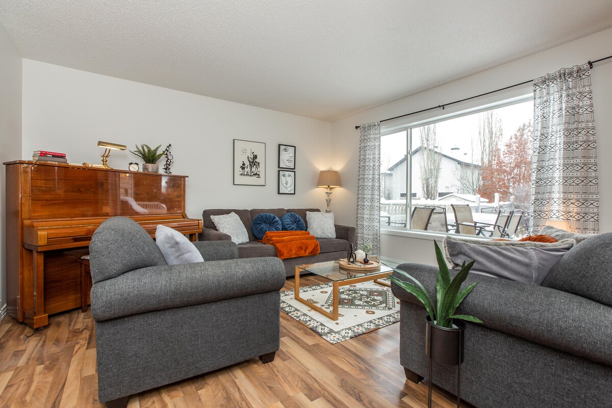Stay in our Stunning Family Home in on of Edmonton's most sought after neighborhoods - Glastonbury! ★ 1650 sq ft Home w/ Private Patio, BBQ & Yard! ★ Two Living Rooms Perfect for Large Families ! ★ King Bed in Primary Suite w/ Walk in Closet! ★ Fast WiFi w/ Dedicated Workspace! ★ 5 Mins to River Cree Resort & Casino! ★ In-Suite Washer & Dryer! ★ Professionally Cleaned! ★ Complementary DISNEY+ ★10 Mins to WEM ! Book Today to Reserve our Cozy Home.