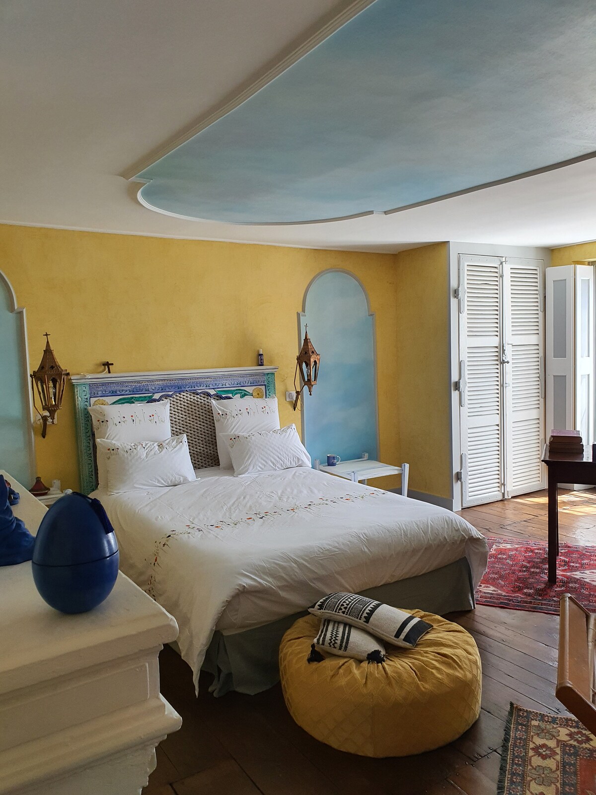 another trip is offered to you in the shade of the chestnut trees... paintings, furniture, decor in the colors of the Orient... of course, as in all the rooms, a welcome tray with espresso maker and teapot, as well as a mini fridge. Come dream under the blue sky of its ceiling...
