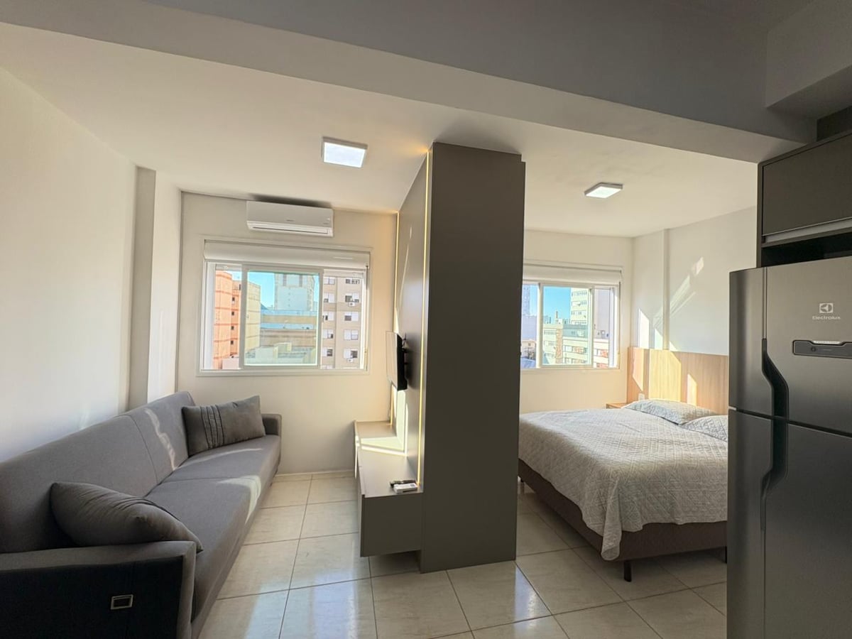 Great location! The studio is located on one of the city's main avenues, close to Atitus Educação, Passo Fundo Shopping, pharmacies, supermarkets and greengrocers. New studio, decorated, designed for you to have a comfortable and peaceful stay. Apartment amenities: -Netflix TV; -Air-conditioning; -Good lighting; -Fast Internet; -Comfortable bed; -Washer and dryer; -Microwave; -Fridge; -Airfryer; - Hairdryer; - Clothes steamer; - Mirror; -Electric kettle.