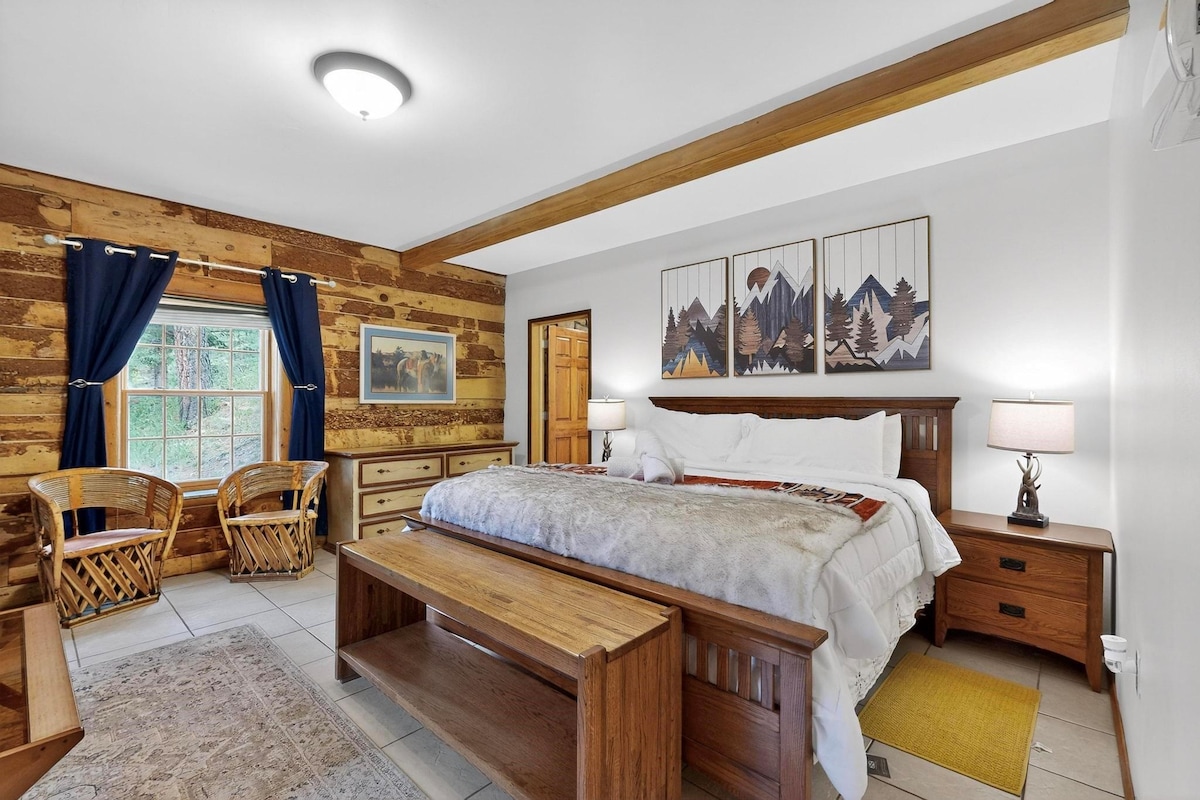 Kick back and relax in this stylish cabin in the forest. Hilltop location with forever views. Just off scenic Route 66 (Hwy 50), up a steep (but short) driveway, sits a 2-bedroom log cabin with plenty of birdsong and pine trees, a porch surrounded by views and furnished with a grill for outdoor dining. Five miles east is the village of Pecos with the Pecos River for fishing, hiking, and exploring. Sixteen miles north is the legendary city of Santa Fe packed with world-class art and culture