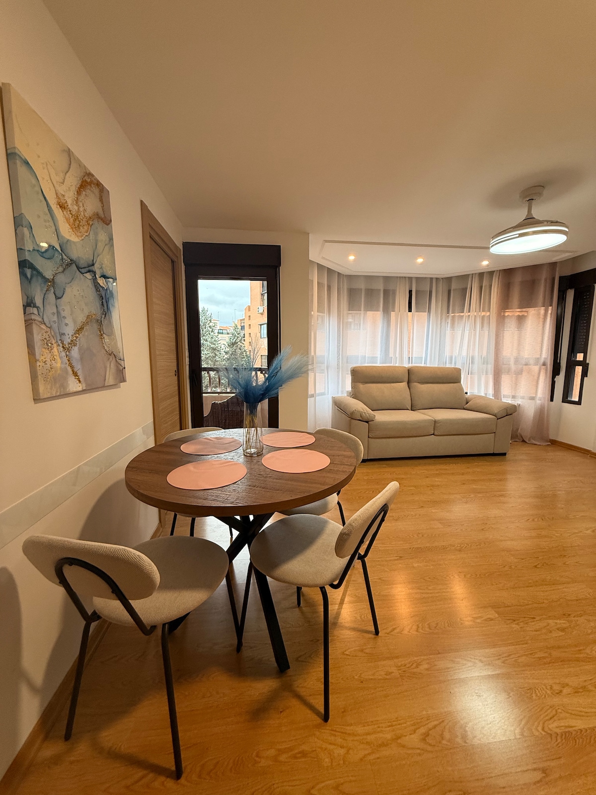 Bright apartment in the heart of Albacete With FREE PARKING included in the price, very close. Located on the fifth floor with an elevator. Fully equipped kitchen: ceramic hob, oven, microwave, Nespresso coffee maker (with complimentary capsules). Washer-dryer for added convenience. Living-dining room with TV, dining table and chairs. Large work area with space for laptop and plugs. Air conditioning and heat pump in all rooms. Bed linen and towels are included.