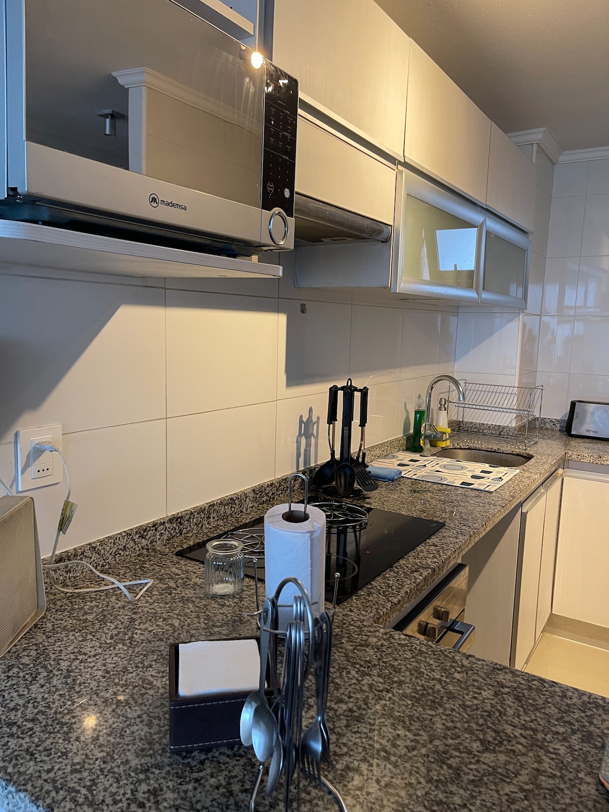 Beautiful front apartment, first line, from the terrace a view of the entire Avenida del Mar and the beach. 7th floor, parking, 2 bedrooms, 2 bathrooms, and 1 futon. New floating floor, kitchenette, TV, Wi-Fi, board games to play as a family and a nice hammock on the terrace. Building Amenities: Gym, tennis court, pool room, swimming pool, sauna, gazebo, 24/7 concierge, children's games, green areas, event room. The beds have sheets and a blanket. 2 towels are left