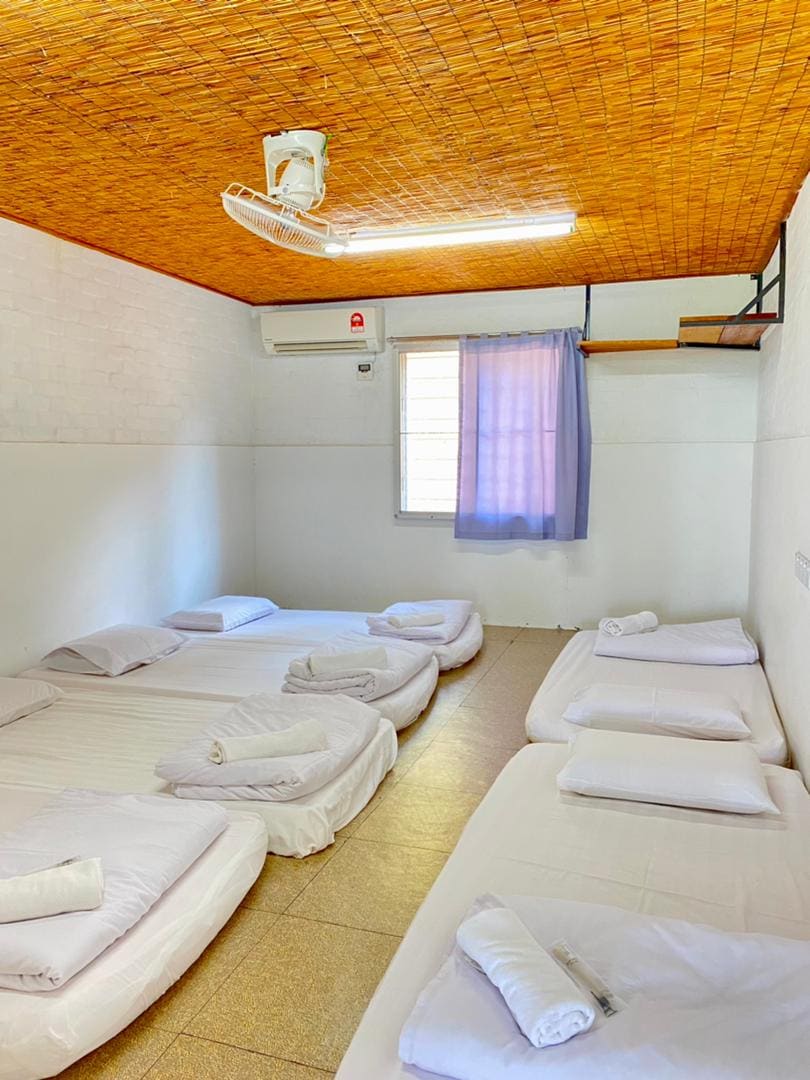 The Cave is a cozy room for six guests, furnished with six single mattresses and equipped with air conditioning, a fan, and lighting for a comfortable stay. Guests have access to a shared toilet with sink located outside the room, as well as a corridor common area , making it a practical and convenient choice for a relaxing visit.