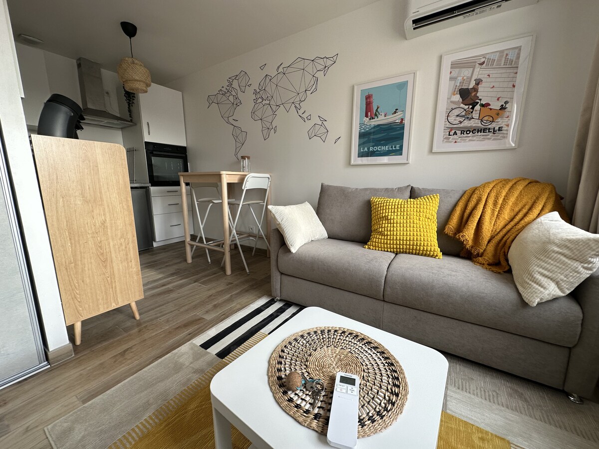 New 24 m2 independent studio, adjoining the owners' house with private sunny terrace. Easy and free parking. Sheets and towels are provided. Close to all amenities: shops, supermarket, Drive-Thru, aquatic center, wooded park with playground, bike paths, bus, market. Possibility to reach La Rochelle, the beaches, the La Rochelle canal in Marans, the Vélodyssée... by bike paths La Rochelle city center is 15 minutes by bus.