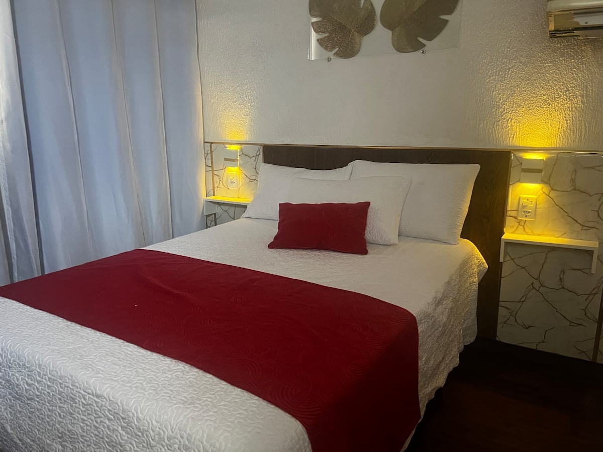 Flat for Family up to 8 people, 250 meters from the beach, fully protected with mosquito net, 1 en-suite with double bed and air-conditioning, 1 bedroom with double bed and bunk bed, 1 compact room with trundle bed, plus 2 single mattresses, large terraces, living room with Wi-Fi and streaming, terrace with barbecue grill, 2 cable/over-the-air TVs, an excellent location with a beautiful panoramic view and great ventilation, covered garage for 2 cars, 24-hour security, elevator access to the Flat.