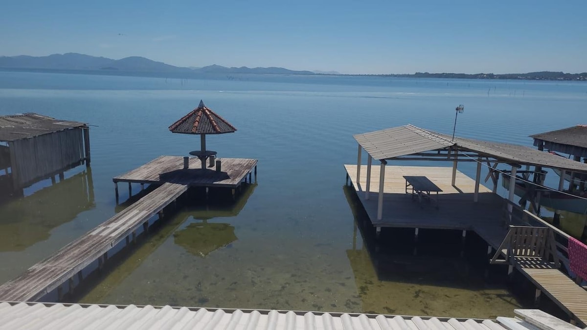 Casa simples de madeira, em local fechado com 4 casa, portão eletrônico e acesso à lagoa de imarui, excelente local para descansar em família, pescar, tomar banho de lagoa, inclusive crianças, por se tratar de local de águas rasas, tem quiosque e acesso coletivo a lagoa, o quiosque pode ser utilizado pelos hóspedes. As únicas exigências são: Não colocação de som Auto em todo ambiente e por Se tratar de um local de pessoas de mais idade, utilizar roupas de banho somente na Lagoa.
