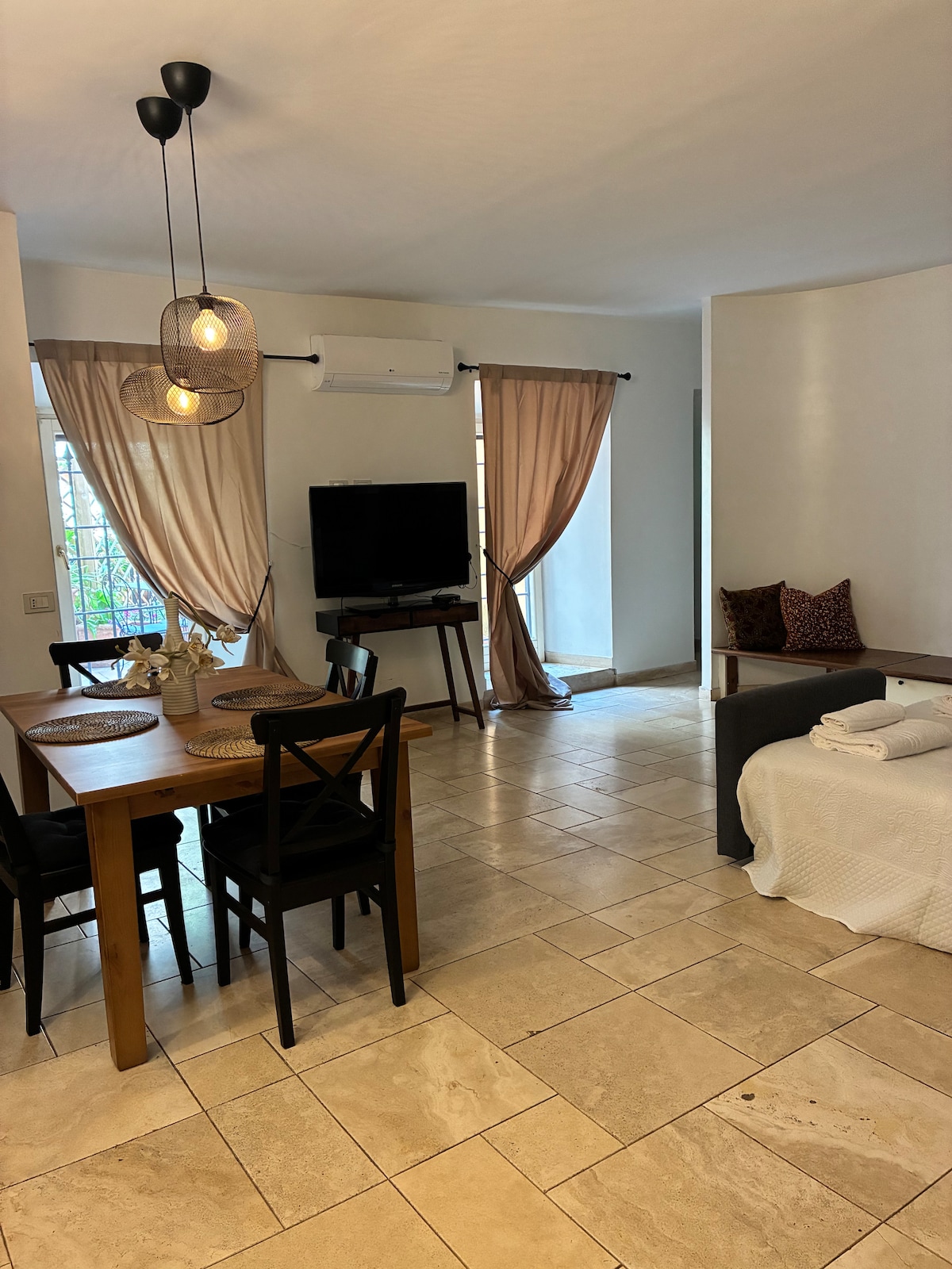 Nestled within a historic building facing one of the most iconic squares in the world, this one-bedroom apartment is located on the first floor and boasts modern amenities and an enviable patio, perfect for alfresco dinners. Ideal for couples or small families, the apartment features top-notch A/C system in all rooms, multi-room wireless sound system, steam bath as well as bathtub . Step outside the front door to toss your coin and immerse yourself in the lively atmosphere of the city center.