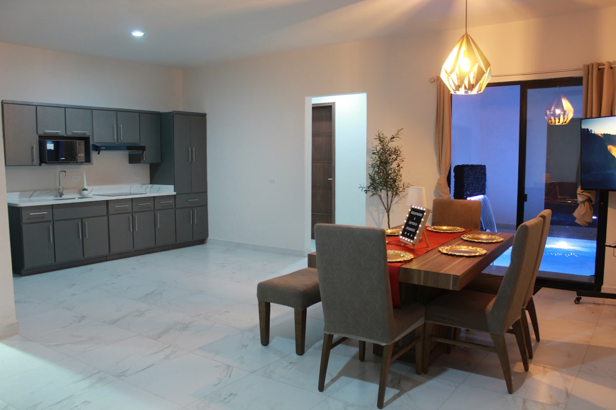 You will love the location of this home, it is the perfect place for those looking for a comfortable and complete stay. The apartment is decorated in a modern and sophisticated style, with high quality furniture. Amenities include: - AC and heat -Equipped kitchen -Private and free parking -Planta baja Also the apartment is located 5 minutes away from the international bridge #1. As well as restaurants,pharmacies and banks
