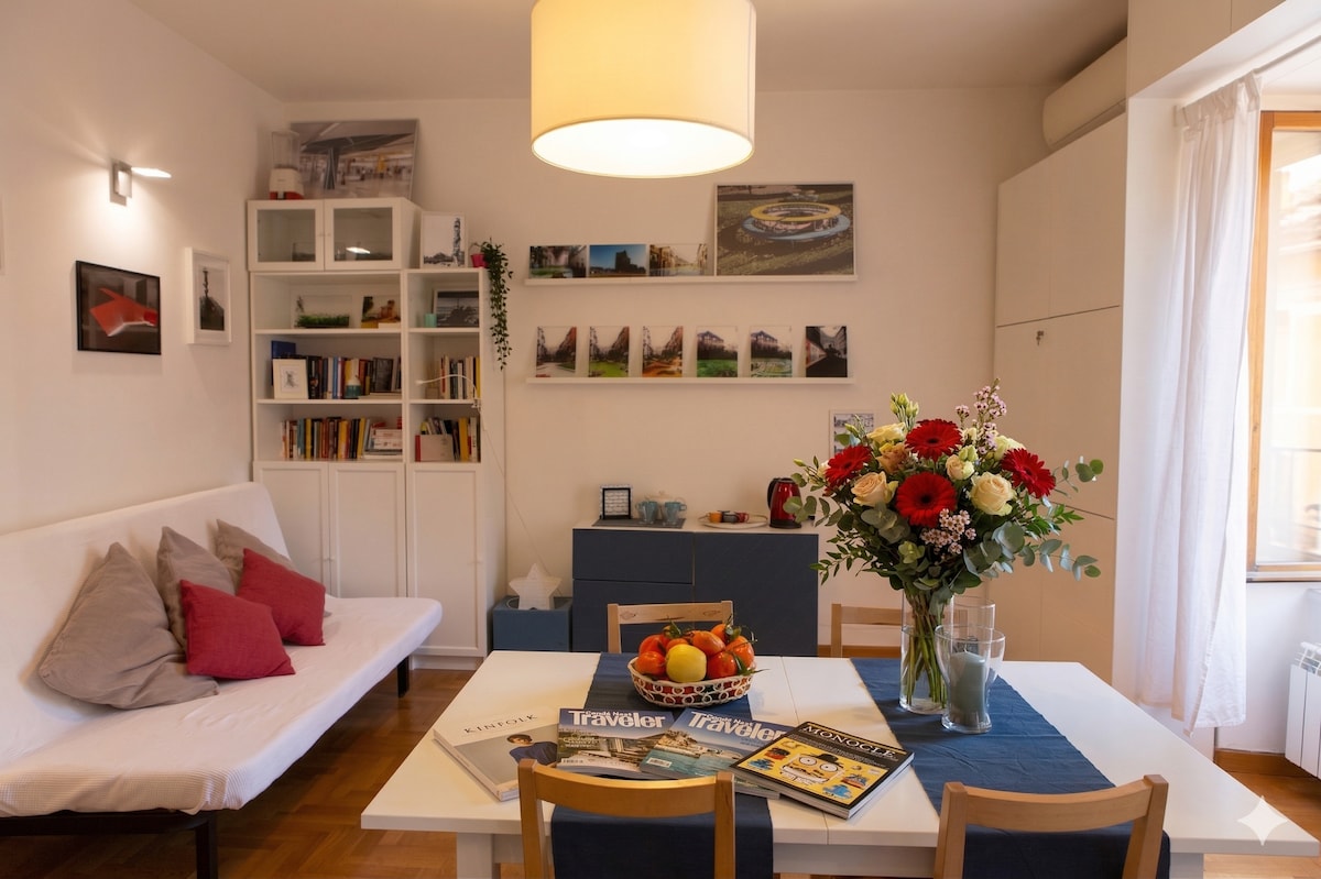 On a characteristic street in the pedestrian island, the heart of Pigneto, a neighborhood that mixes Roman spirit and modernity. The New York Times called it "The Roman Brooklyn", with open-air bars, restaurants and a typical market. The apartment, a former architectural studio, is on the 1st floor of a historic building. Ideal for: couples, smart workers thanks to natural light, the convenience of the work/dining table, and the well-connected area.