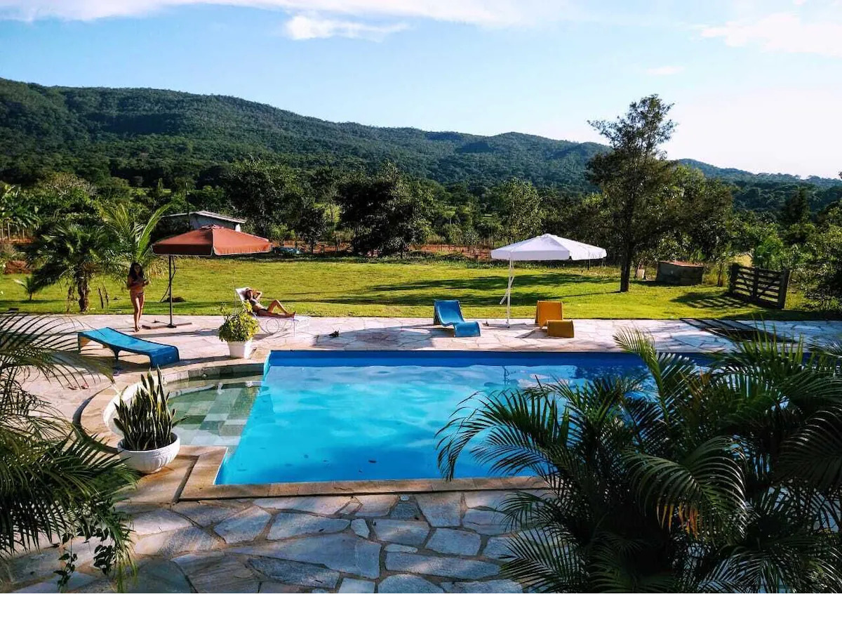 A great place for those looking for peace and quiet as we are located just 6 km (just 200 meters on a dirt road) from the Historic Center of Pirenópolis. -House with two en-suites - Air-conditioning in the bedrooms -Wi-Fi -Full Gourmet Kitchen - Recreation space (soccer/volleyball) -Solar heated pool - space for a bonfire - TV (bedrooms/leisure area) - hammocks for resting - A place with plenty of space and privacy -Location allows hiking in nature - Pets are welcome - Games