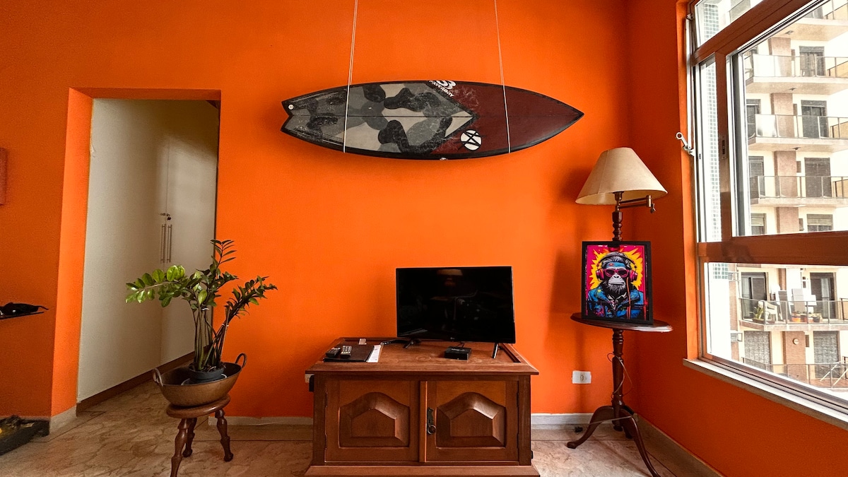 Foot in the sand, beach right in front, just even cross the street. Daikin cold/hot air conditioner in the living room and 2 bedrooms, 2 bathrooms, ultra fast WI-FI, smartTVS LG 50" and Samsung 43".Ampla balcony, amazing view of the beach, table,chairs, net. Floor alto, clear,airy,best point of the boardwalk. Ventilator ceiling or wall in every room. Full kitchen. Excellent location, do everything on foot: bakery,restaurants,bars, shops,banks,markets,pharmacies,shopping,etc. Beach service. 24-hour gate.