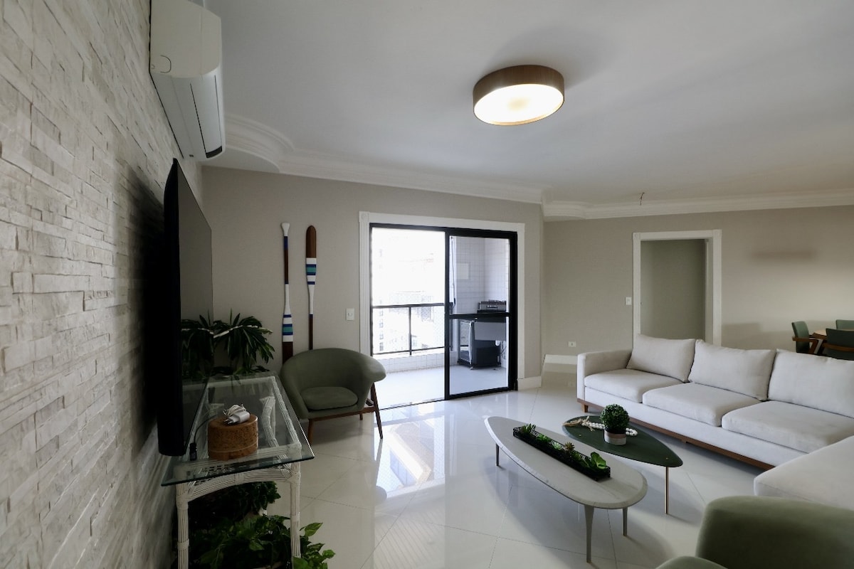 Beautiful renovated apartment on Pitangueiras Beach, Guarujá, with full sea frontage. Maximum 9 people, including children. Located in the best part of Pitangueiras, you can do everything on foot. 250 mbps Internet - Wi-Fi, Netflix. 4 bedrooms, 3 bathrooms, 1 suite. Large balcony. 55” Smart TV in the living room. Smart TV in the bedroom. Garage for one car Kitchen utensils, water purifier, rice cooker, sandwich maker, blender, toaster. 160 meters from La Plage shopping mall.