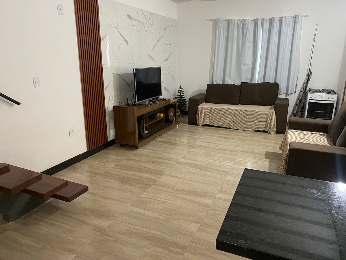 New, newly renovated, spacious and airy and independent house for your comfort, ideal for families, quiet neighborhood and without noise, it is possible to reach the beach walking. On the first floor: 1 bedroom with suite, living room with double sofa bed, 1 armchair, tv, wi-fi, kitchen, social bathroom, gourmet aréa, barbecue, chairs, tables, service aréa, garage for 4 cars, outdoor shower. On the second floor: 3 bedrooms, 1 bathroom, living room with double sofa bed, tv and all utensils for your convenience.