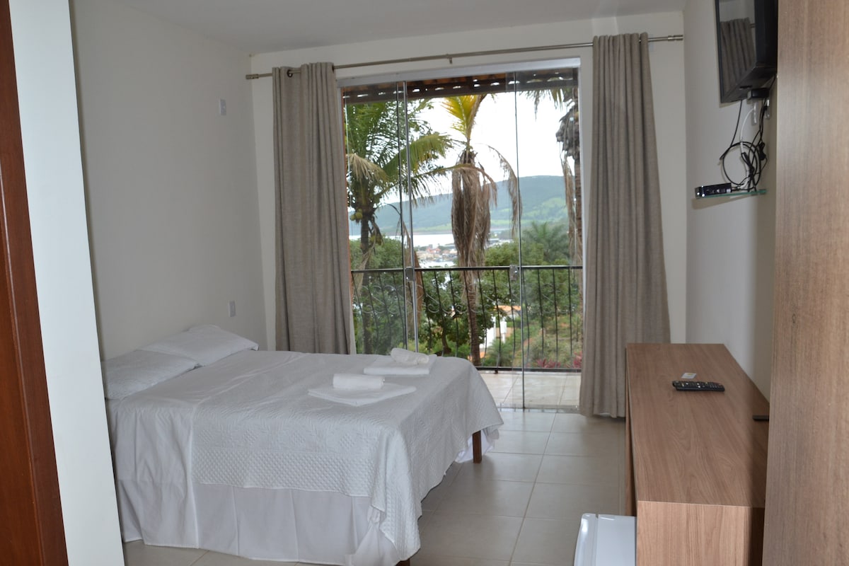 Quarto Econômico - Pousada Riviera Shangrylá Ideal para casais, o quarto econômico possui cama de casal, TV, frigobar, cabideiro, roupas de cama e ventilador. Não possui banheiro privativo, mas inclui café da manhã e jantar, acesso a todas as comodidades: piscina, quiosques para churrasco, restaurante, área verde e Lago de Furnas. Aproveite momentos únicos e nossos passeios de lancha enquanto economiza em sua estadia!