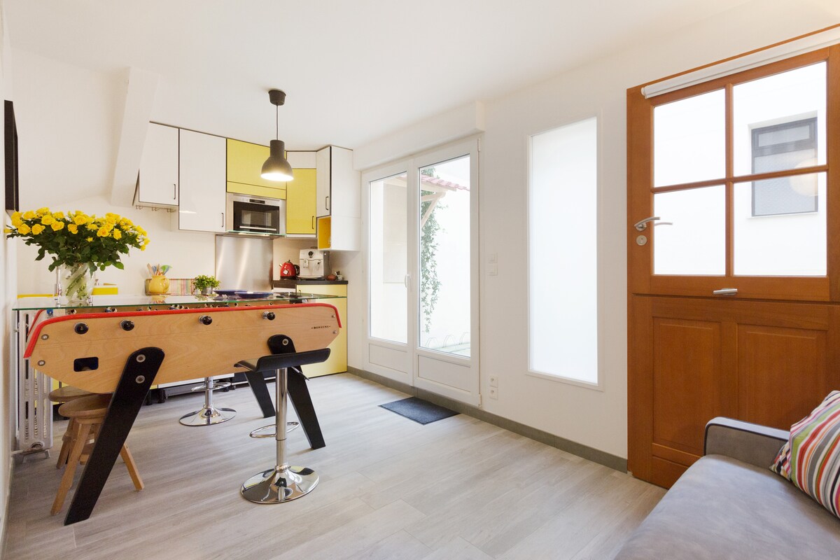 Rare. Like a small country house, in a tree-lined alley, this artist's studio tastefully furnished on two floors, will allow you to put your suitcases in a place full of charm. 15 minutes from the Marais or the center by metro. Shops nearby and the famous market of Place des Fêtes, Belleville district. You can enjoy the outdoors for lunch or enjoy an aperitif in the sun. +Barbecue. Exceptional. Ideal for a couple. Possible for 3 with reservation.