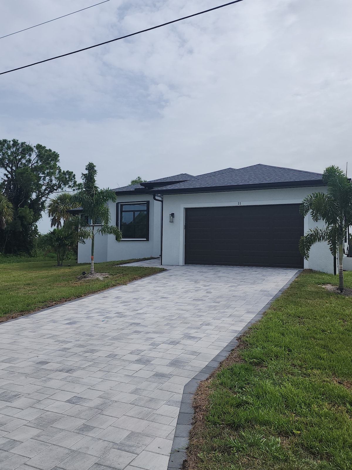 The exterior of a remodeled home is framed by soft sunset hues, revealing a welcoming entrance with large windows. A landscaped lawn features low-maintenance plants along the pathway leading to the front door, complemented by a spacious driveway and garage.