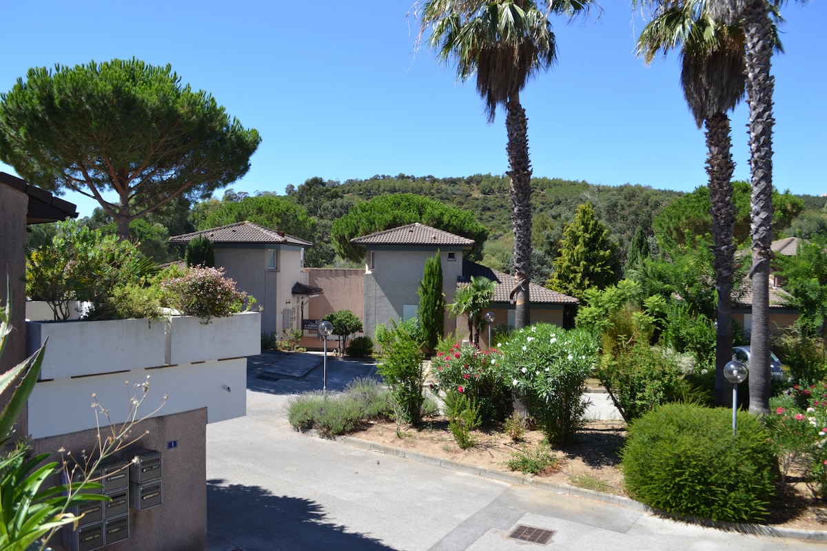 In a small private residence with swimming pool and private tennis court and without traffic, Studio-mezzanine located on the 1st floor with 1 bedroom and corner terrace with 180° panoramic sea view. Great for families with kids (4 people). 1 bedroom + 1 mezzanine, kitchen, living room, bathroom. Everything is within walking distance: swimming pool, sea, tennis, shopping, bread, restaurants... Included: Linens and towels, Wi-Fi, beach mattress, swimming pool, tennis, parking space...