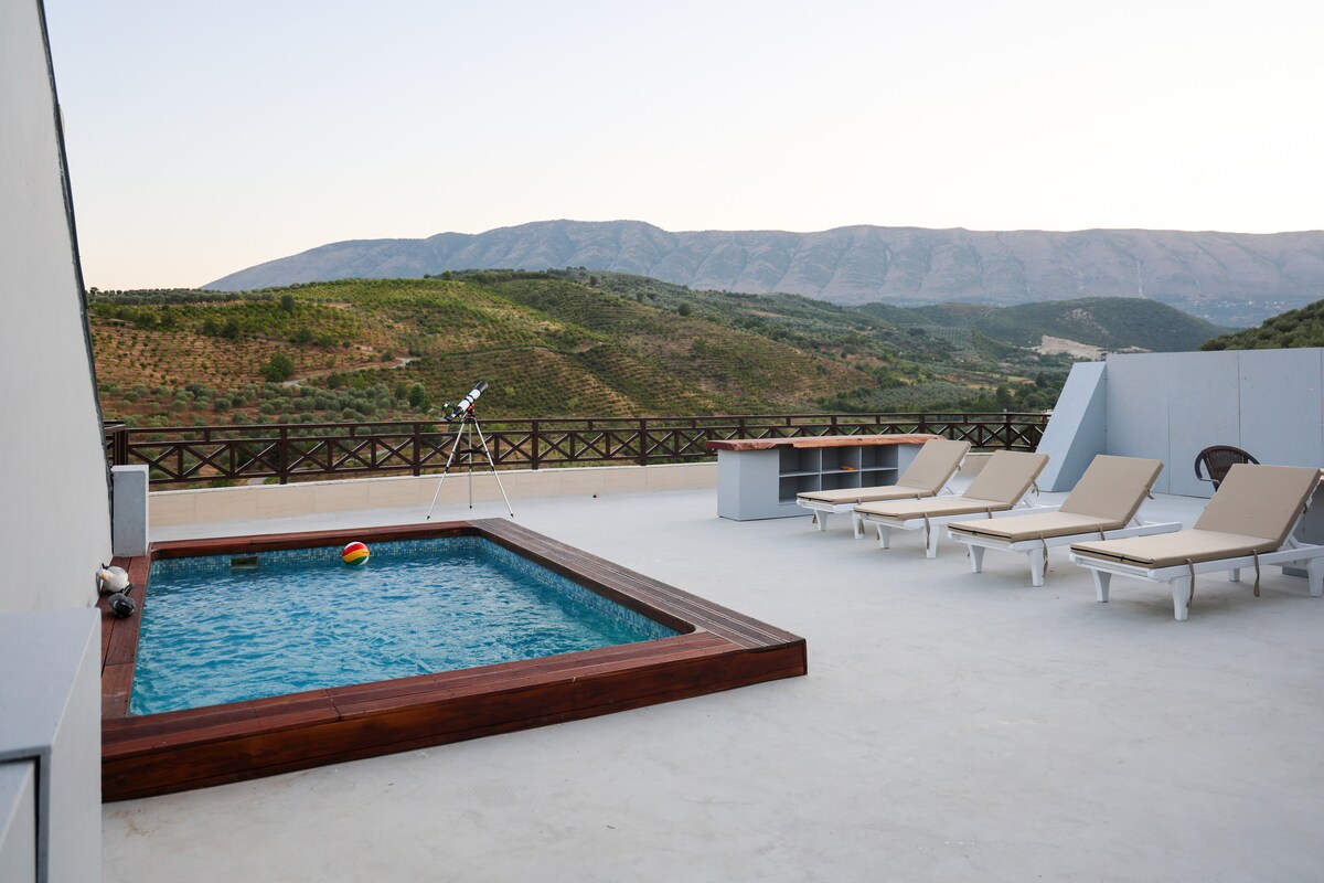 Our villa, nestled in the village of Drobonik, is just a 5-minute drive from the historic city .Featuring a pool, a fully-equipped kitchen, and all the amenities needed for families and groups of friends, our villa offers an idyllic retreat. Surrounded by natural beauty, it boasts views of Berat from above. This is 2nd Floor of our villa perfect for everyone. Facilities including air-conditioned, lobby, balcony, poolside beds, garden. Guests can also enjoy outdoor dining with our BBQ area.
