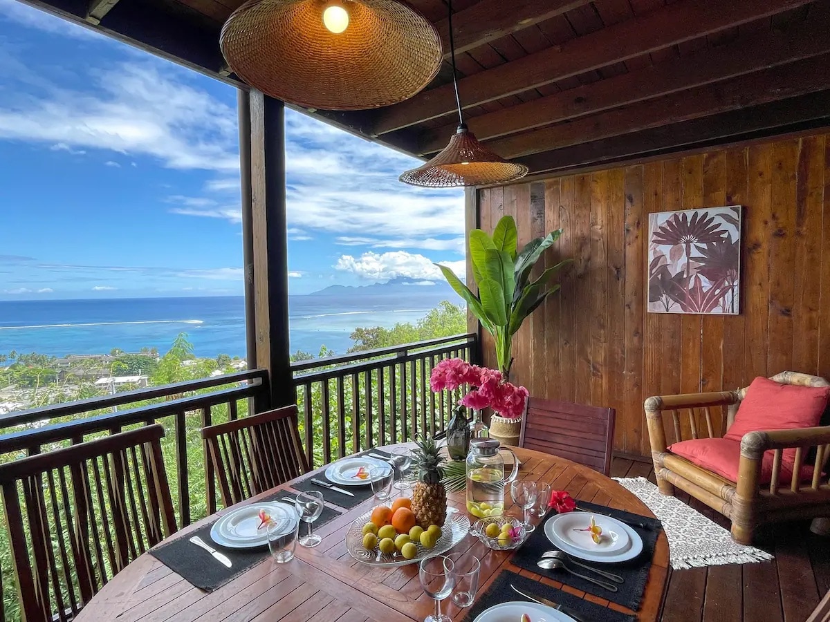Perched at 1,500 ft (460 m) on Tahiti’s presqu’île, this private, very well equipped and comfortable home offers stunning views of the mountains, lagoon, and reef. Set on a 1,800 m² (19,375 sq ft) property for max privacy, it is very quiet and surrounded by nature. Just 4 minutes from the main road, enjoy cooler temperatures. Ideal for 2 couples with separate bedrooms and bathrooms, or families, or just couples seeking space and privacy. Beaches, shops and Teahupo’o are nearby. Car required.