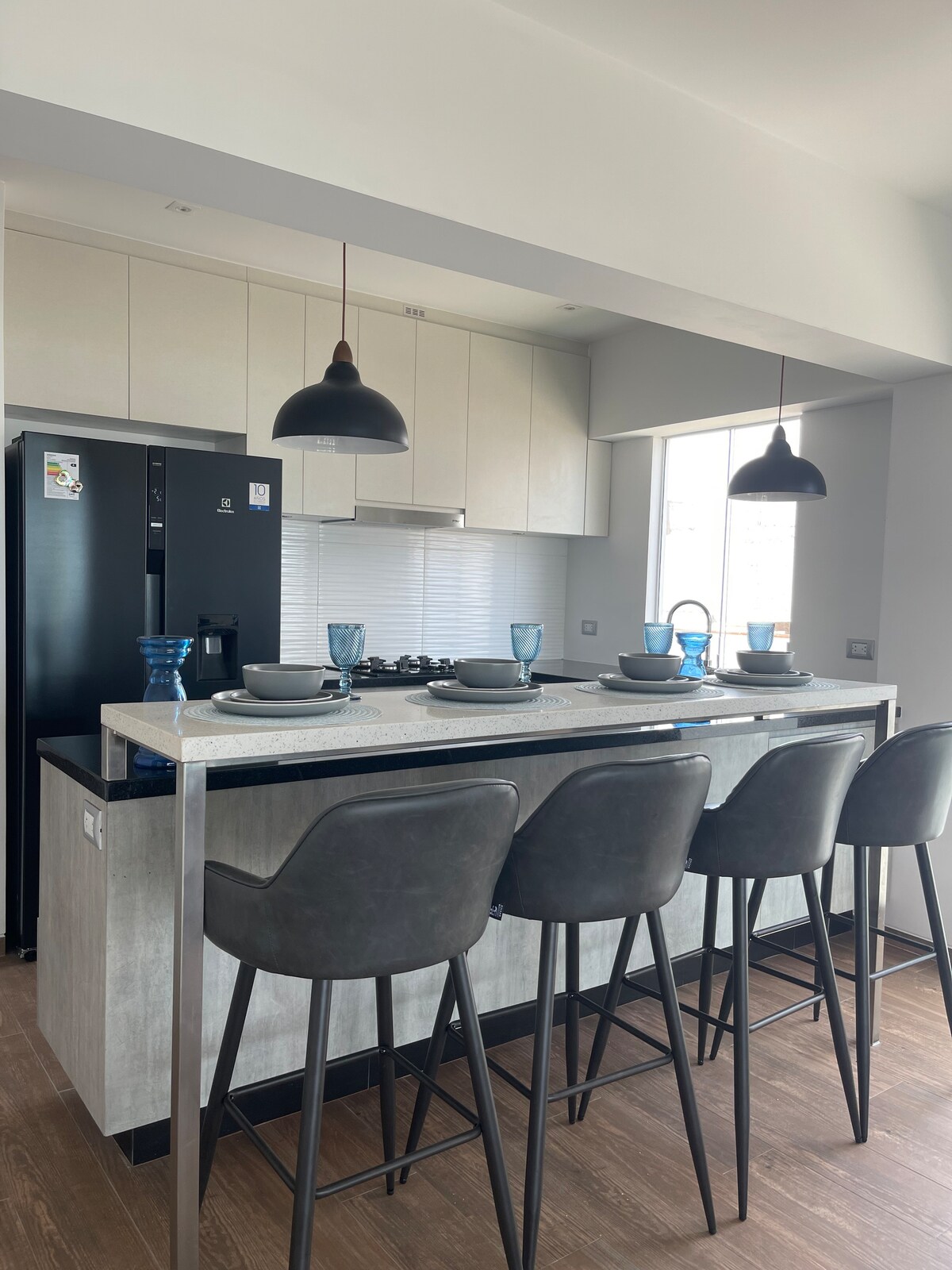Moderno departamento a 6 cuadras de playa Blanca y Club náutico de P. Hermosa,con lindos acabados de lujo,a 40 minutos de Miraflores, 4to piso, buena vista, totalmente amoblado, cuenta con cochera y ascensor, fácil acceso directo a la playa. 2 habitaciones cómodas,2 baños,agua caliente,2 tv smart,cable, también cuenta con cocina(microonda,air frye,refrigeradora,muebles,barra etc) totalmente equipado balcon y terraza con parrilla. Un lugar para pasarla muy bien entre amigos,parejas o familiares.