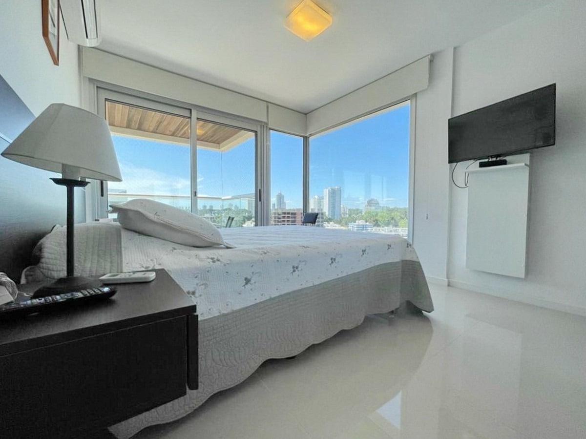 New Apt, Premium Tower 1st. level, 15th Floor Beach service at Stop 7 and 1/2 of Playa Brava. Wonderful views of Playa Mansa, Gorriti Island, part of Playa Brava and the Peninsula. It has all the premium amenities, steps away from the Shopping Center, Design District and the best restaurants in Punta del Este, daily maid service, indoor pool, outdoor pool, sauna, games room, 3D cinema room, 4 barbecues, garage, 1 bedroom with a queen-size bed, 2-seater sofa bed in the living room.
