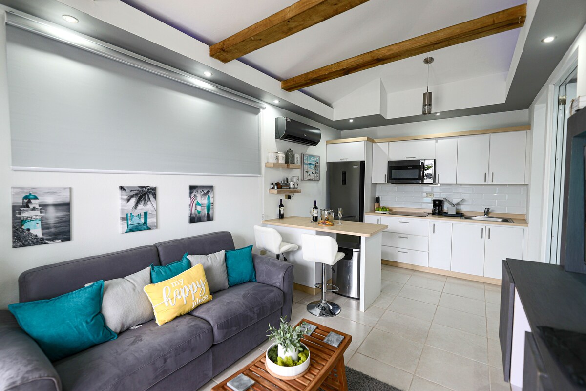 Blue Coral Villa, located a few steps away from the clear waters of Buyé Beach in Cabo Rojo, PR. Enjoy our relaxing accommodations in a thoughtfully decorated Coastal Boho design and tropical scenery of the west side coast of PR. A private place with control access and pool, perfect vacation stay for the whole family. It accommodates 6 people with two comfortable queen size beds, a sofa bed, air conditioning, Wi-fi, a 50in Smart TV with Netflix, Disney +, and Hulu.
