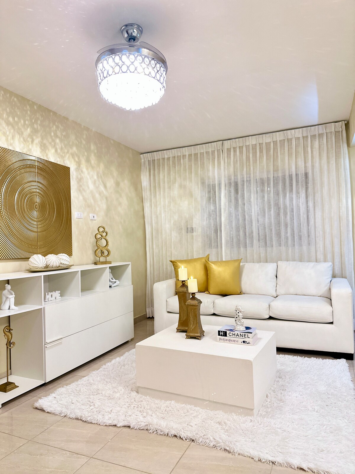 Welcome to our serene Sousa, Puerta Plata retreat! Our 27sqm Airbnb blends comfort and functionality. Featuring a versatile kitchen, elevated bed with storage, and a dual-purpose balcony. Gold and black tones highlight the kitchen, starring a custom breakfast bar. Smart hubs, local art, and a floating shelf media center add personalized touches. White, black, and green tones create a modern tropical oasis. Your Sousa escape begins here.
