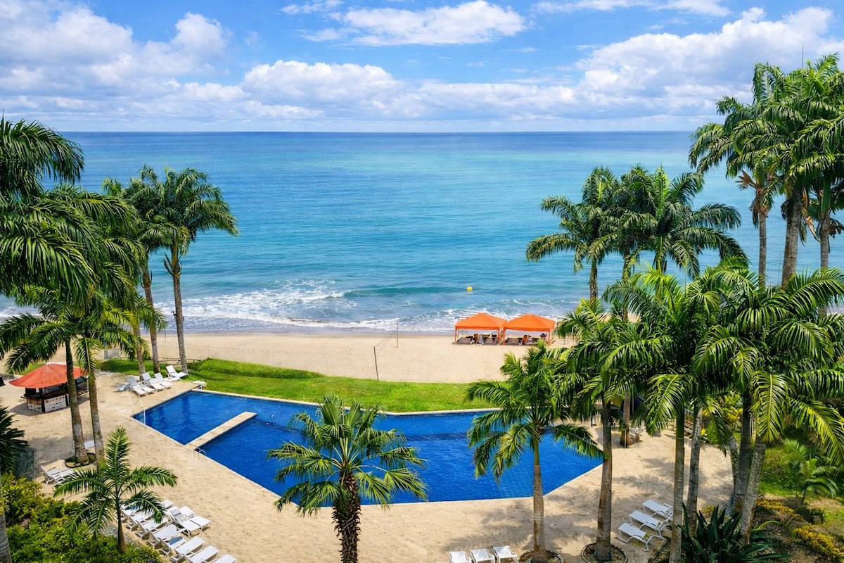 Oceanfront suite with internet service; located in Tonsupa-Esmeraldas in the Playa Azul Resort, fully equipped with an American-style kitchen. Flat screen TV with Directv service included in the price. Two sofa beds. Room with king size bed, 2 full bathrooms, large balcony with a wicker living room and vintage style dining room where you will enjoy your breakfast and lunch overlooking the ocean. Appreciate it, take care of it and enjoy every detail.