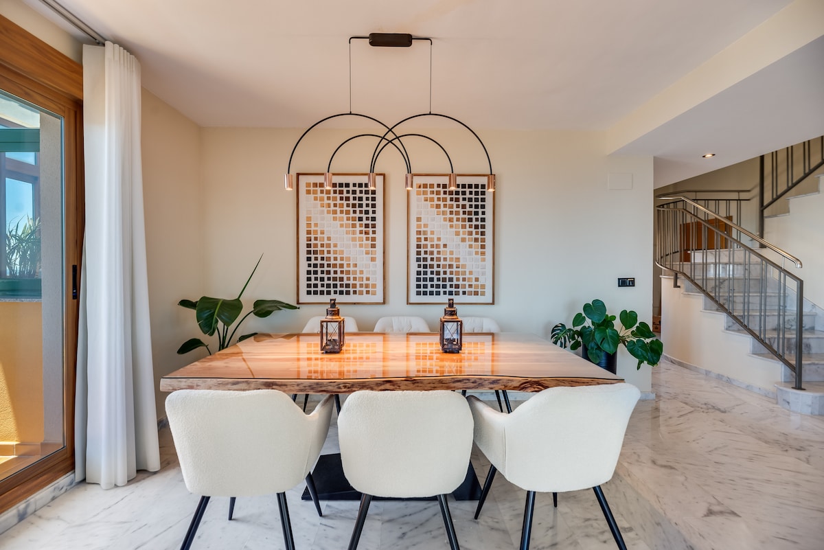 Luxurious penthouse located in Benalmádena Costa. Come and immerse yourself in a wonderful experience by staying in this 220 m² apartment. Wake up to stunning views of the Mediterranean and unwind from your daily routine. The apartment has 2 floors, 3 bedrooms upstairs with en-suite bathrooms, and the master bedroom on the lower level with an en-suite bathroom, plus an additional bathroom in the dining area. It features two terraces designed for the enjoyment and comfort of its guests.