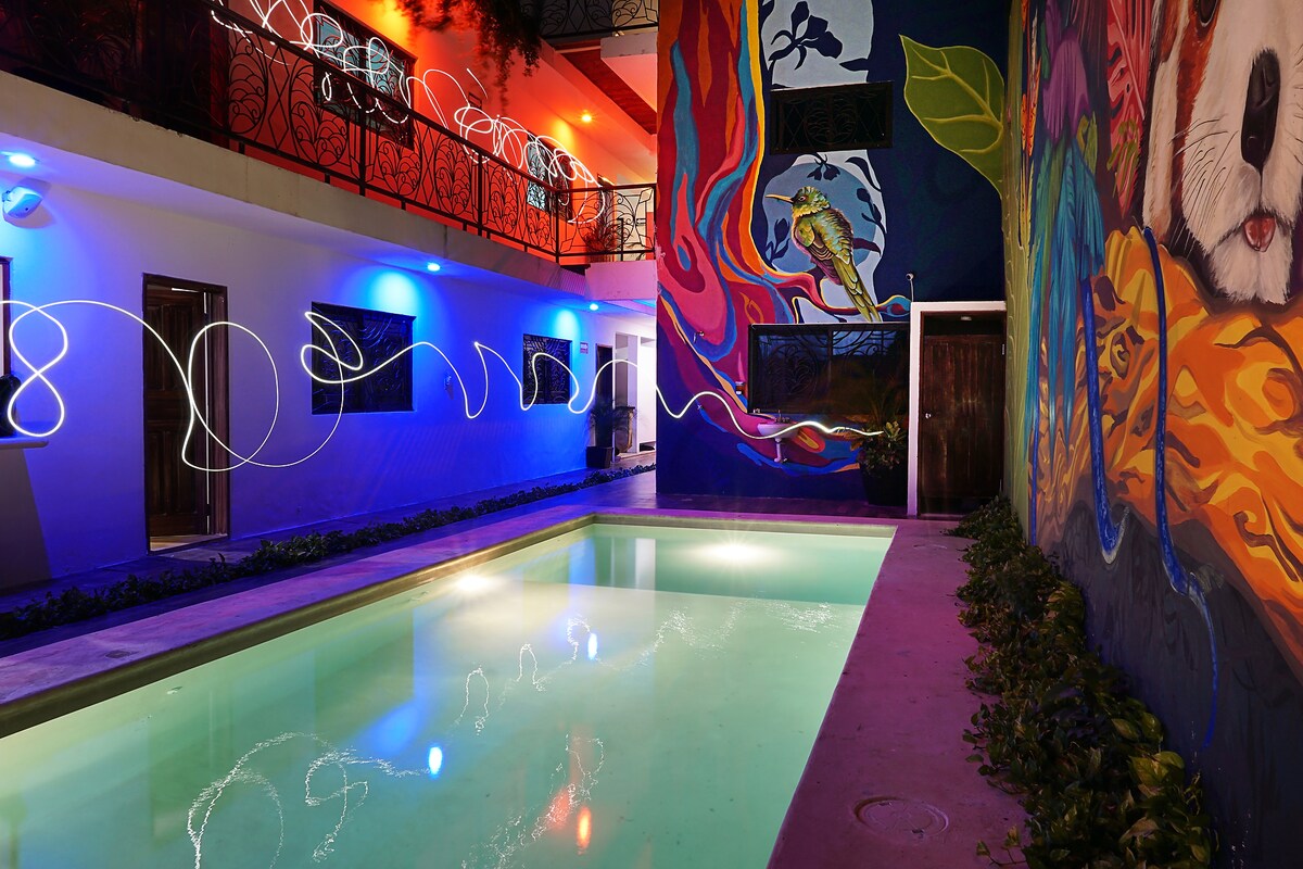 Located in the heart of Playa del Carmen within a beautiful Mexican house with an outdoor swimming pool, garden and terrace. The open and flowing layout encourages community interactions while still allowing opportunities for privacy and relaxation. We want to create a unique space that is fun, creative and welcoming of people from all over the world. We offer our guest free Wifi, Netflix TV, coffee and tea making facilities, common areas, and board games.