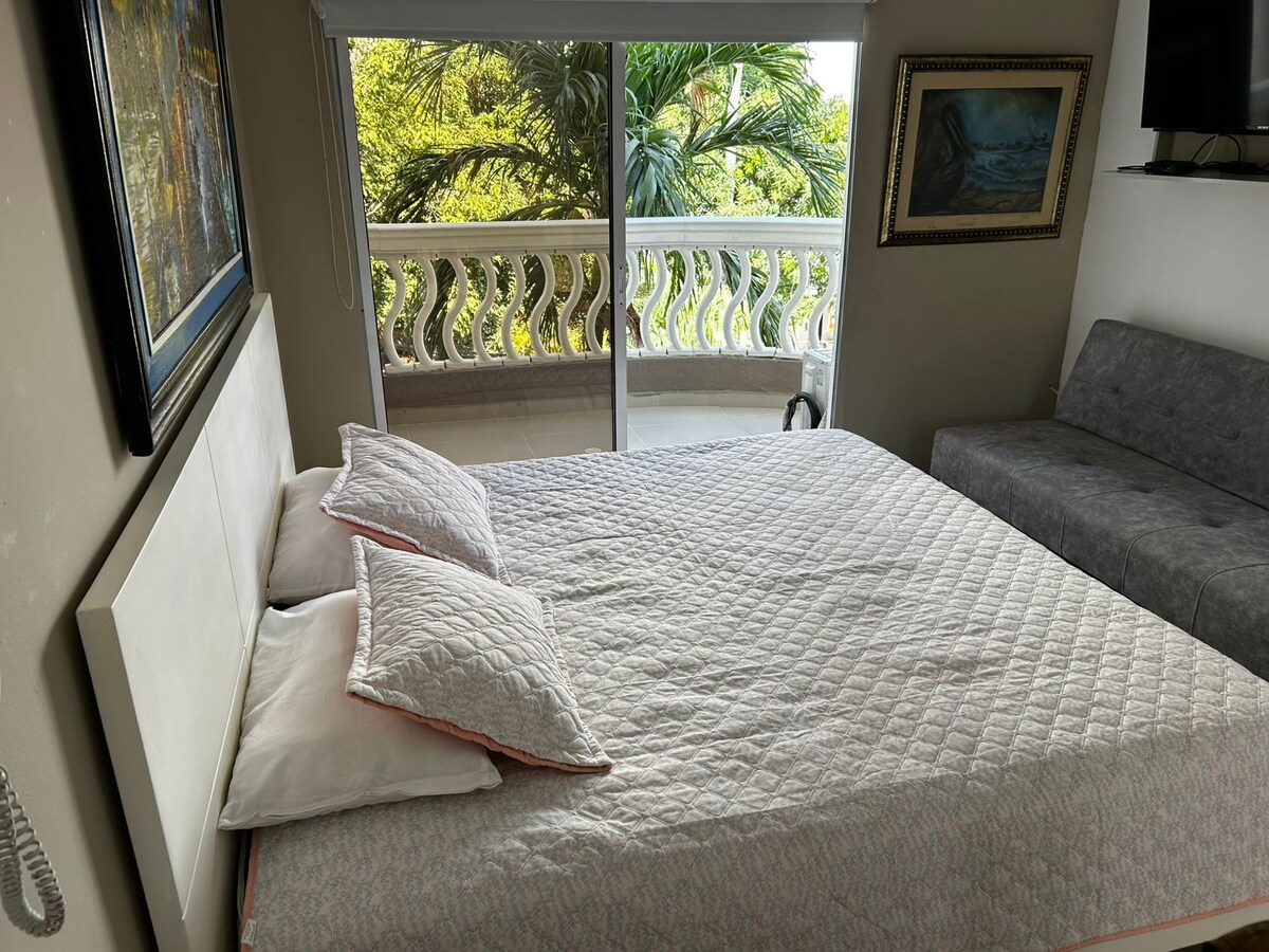 Hermoso y acogedor apartaestudio con salida directa al mar, acceso a varias piscinas y jacuzzis, espectaculares vistas y acomodación 5 estrellas. Ubicación ideal para quienes buscan descanso y tranquilidad sin perder la cercanía a tiendas y restaurantes a solo 20 minutos del Centro Historico. Area 53 m2 Balcón amplio con vista al mar y al rio BBQ Cama King size, 2 camas nido y 1 sofa cama doble AA y abanicos TV y WIFI Agua Caliente Estacionamiento Privado y cubierto Cocina totalmente equipada
