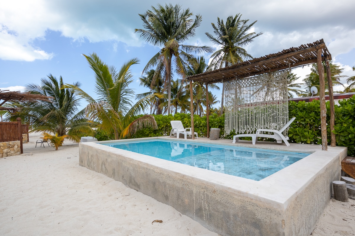 Villa Lujosa decorada vibra "Tulum" con acabados y muebles de lujo. Perfecta para unas vacaciones frente al mar Disfruta la terraza y una pequeña piscina para refrescarte saliendo del mar. Duerme la siesta en una hamaca con una espectacular vista desde la habitación principal y disfruta el sonido de la naturaleza. No cobramos energía eléctrica y tenemos generador de energía para emergencias, así que nunca te quedaras sin energía y sin aire acondicionado, que por cierto tenemos en todos lados :)