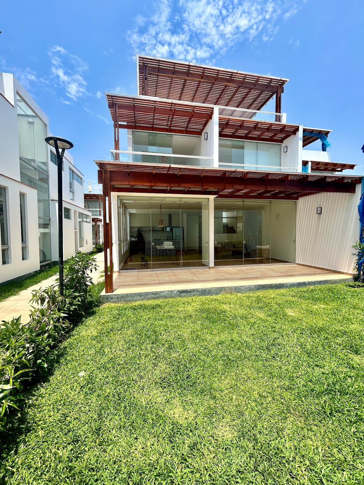 Solo para familias. A 8 minutos del Boulevar de Asia. Solo se permiten 14 personas. La casa cuenta con 5 cuartos, 6 baños, terraza en el 3er piso con pequeña piscina, sol y sombra y zona de parrilla. Cocina, horno, refrigeradora, terma, lavadora, televisores con cable y artefactos eléctricos. Estacionamiento propio. Estacionamiento para invitados dentro del condominio sujeto a disponibilidad. No están permitidas las mascotas. Incluye sábanas. No incluye toallas, jabón, champú o detergente.