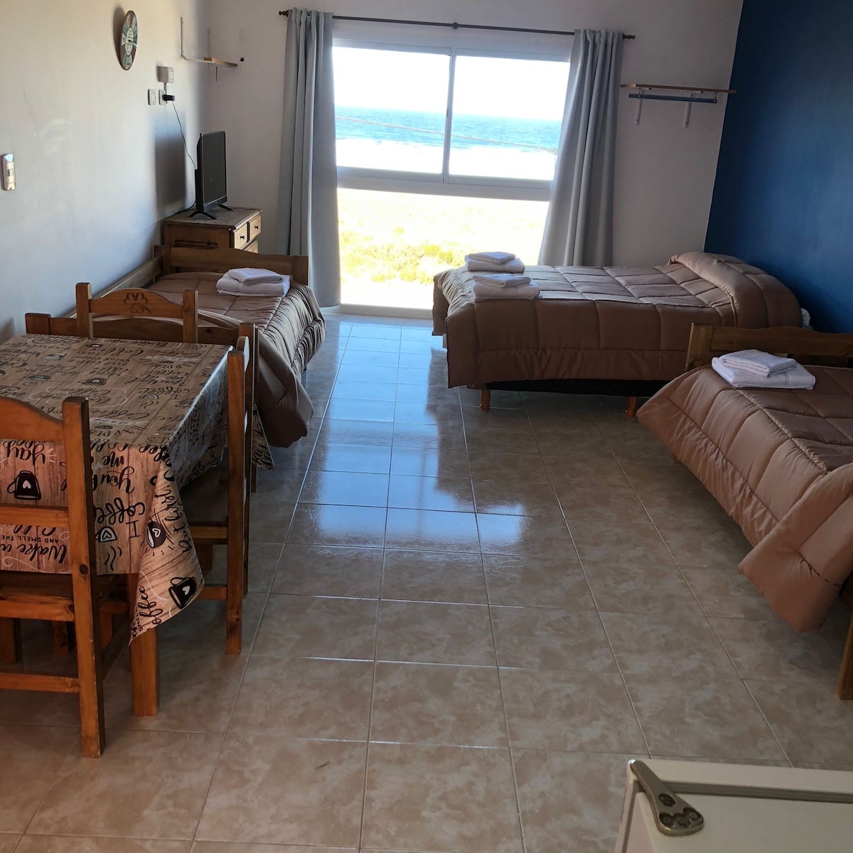 Te invitamos a hospedarte en vientos del salado Tenemos departamentos y dúplex para 2, 4 y 6 pax! �Departamento de 1 habitación equipado para 2 personas. Cama matrimonial. Ropa de cama. Wi-fi. Direc tv. Balcón compartido con chulengo. Ubicado a 400 mtrs del mar. Contamos con habilitación de la secretaria de turismo de Sierra Grande. Aceptamos tarjetas de débito y crédito!
