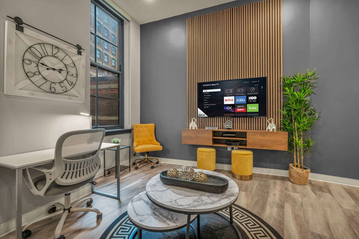 Welcome to your Home in Cleveland! Located in a historic building in the heart of downtown, you’ll feel the city's charm while having all the modern amenities you need. ➹ Spacious Downtown Loft ➹ FAST 100mb Wi-Fi for work or streaming ➹ 24/7 Gym with sauna and tanning bed ➹ Memory foam beds for a great night's sleep ➹ Smart TVs for your favorite shows ➹ Fully stocked kitchen We genuinely LOVE hosting and want your stay in Cleveland to be amazing — reach out with any questions!